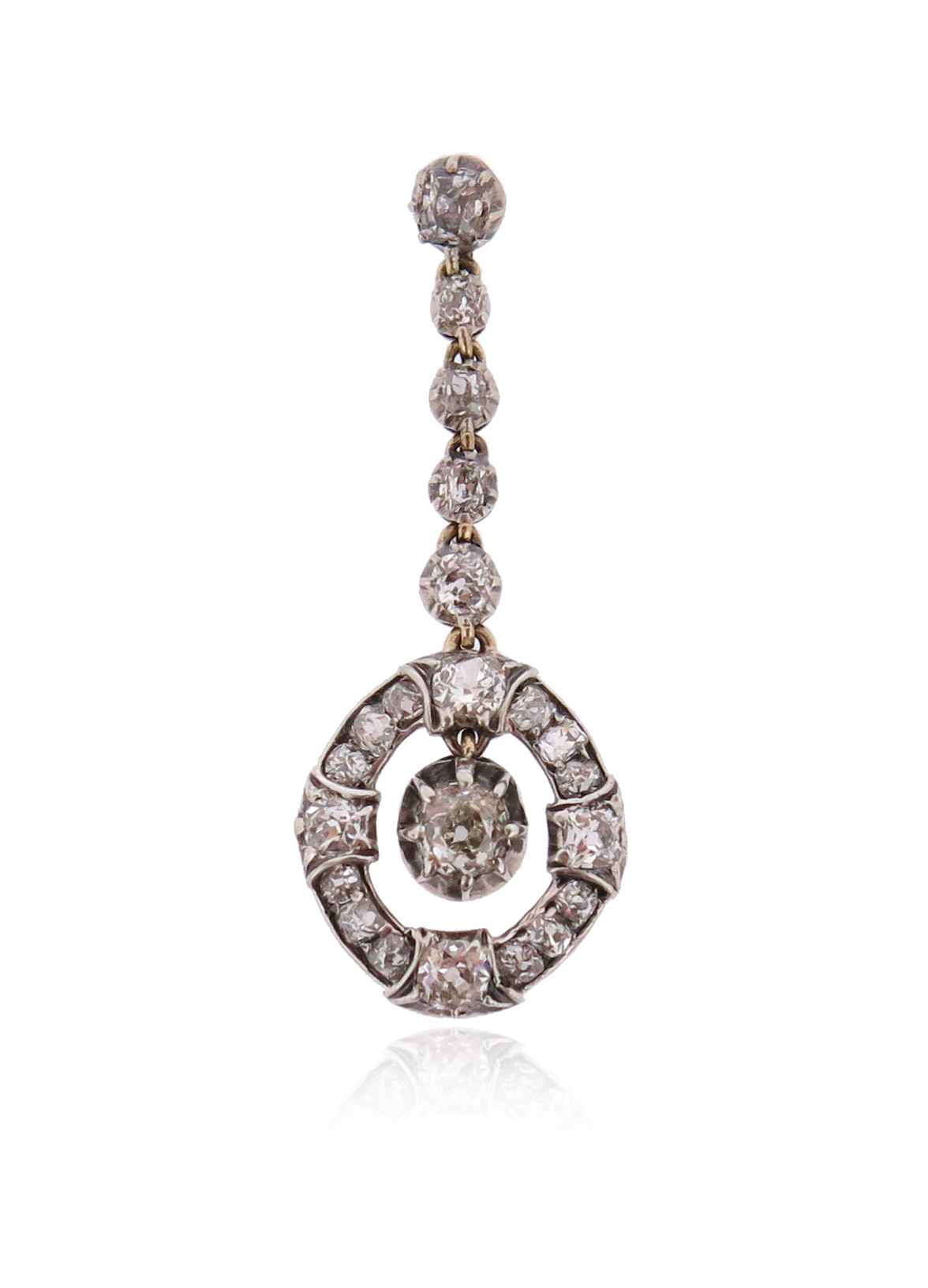 A 19th century diamond-set pendant, the articulated old circular-cut diamonds suspend a further diamond within an oval diamond border in silver on gold, 4cm high