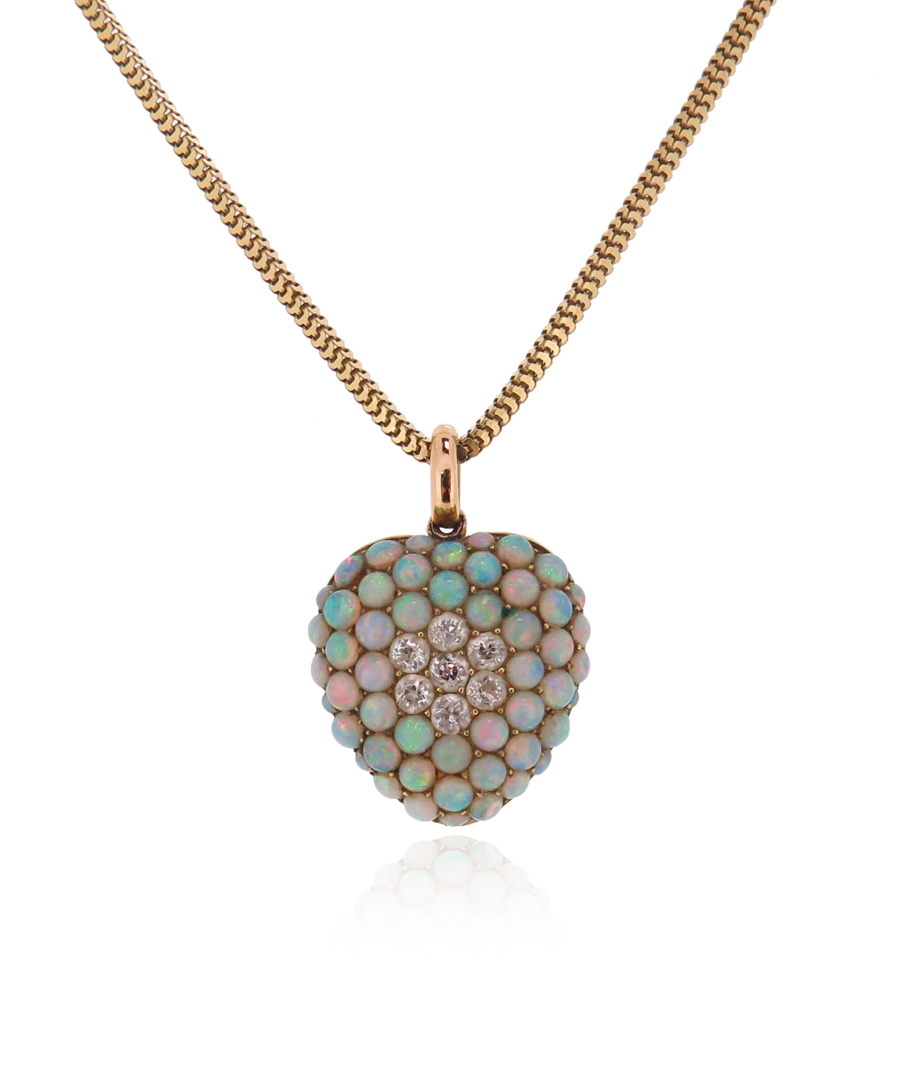 A Victorian opal and diamond heart pendant, pavé-set with opal cabochons and a cluster of old circular-cut diamonds in yellow gold, glazed locket compartment to reverse, 3cm high including bale, on a snake-link gold chain, 54cm long