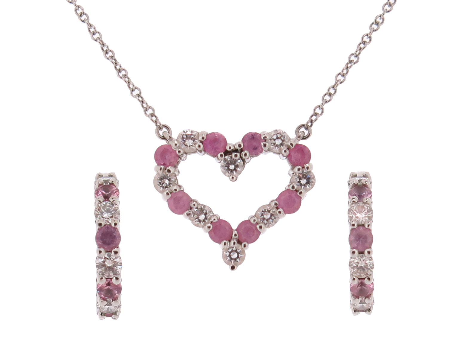 A pink sapphire and diamond 'Hearts' pendant by Tiffany & Co., set in platinum on fine-link platinum neck chain, pendant and chain signed, 42cm long, Tiffany & Co box, with a pair of matching pink sapphire and diamond hoop earrings by Tiffany & Co, in platinum, signed, Tiffany & Co case