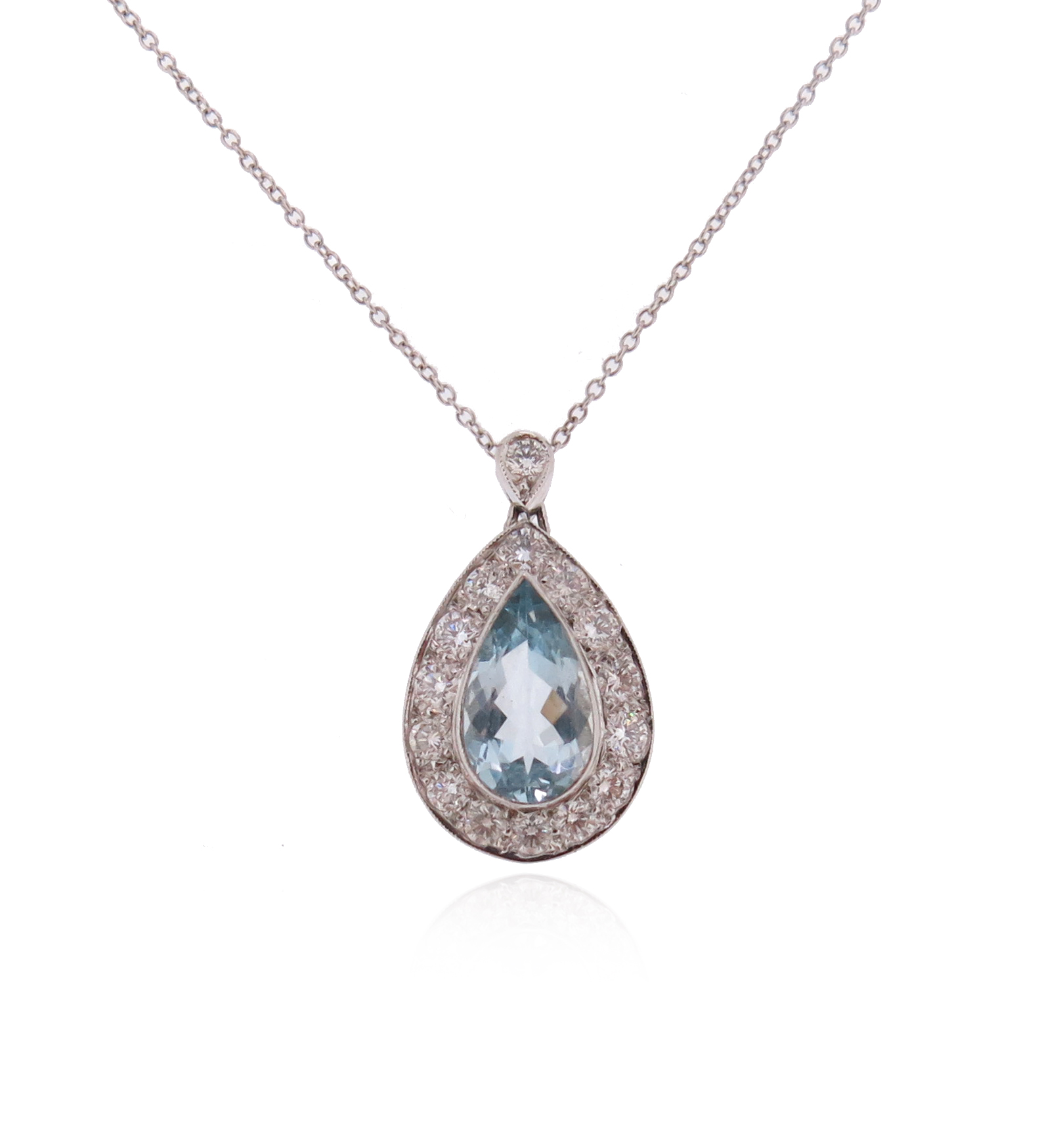 A aquamarine and diamond pendant, the pear-shaped aquamarine millegrain-set within a surround of round brilliant-cut diamonds and a diamond bale in white gold, 19mm high, on fine-link white gold neck chain, 38cm long