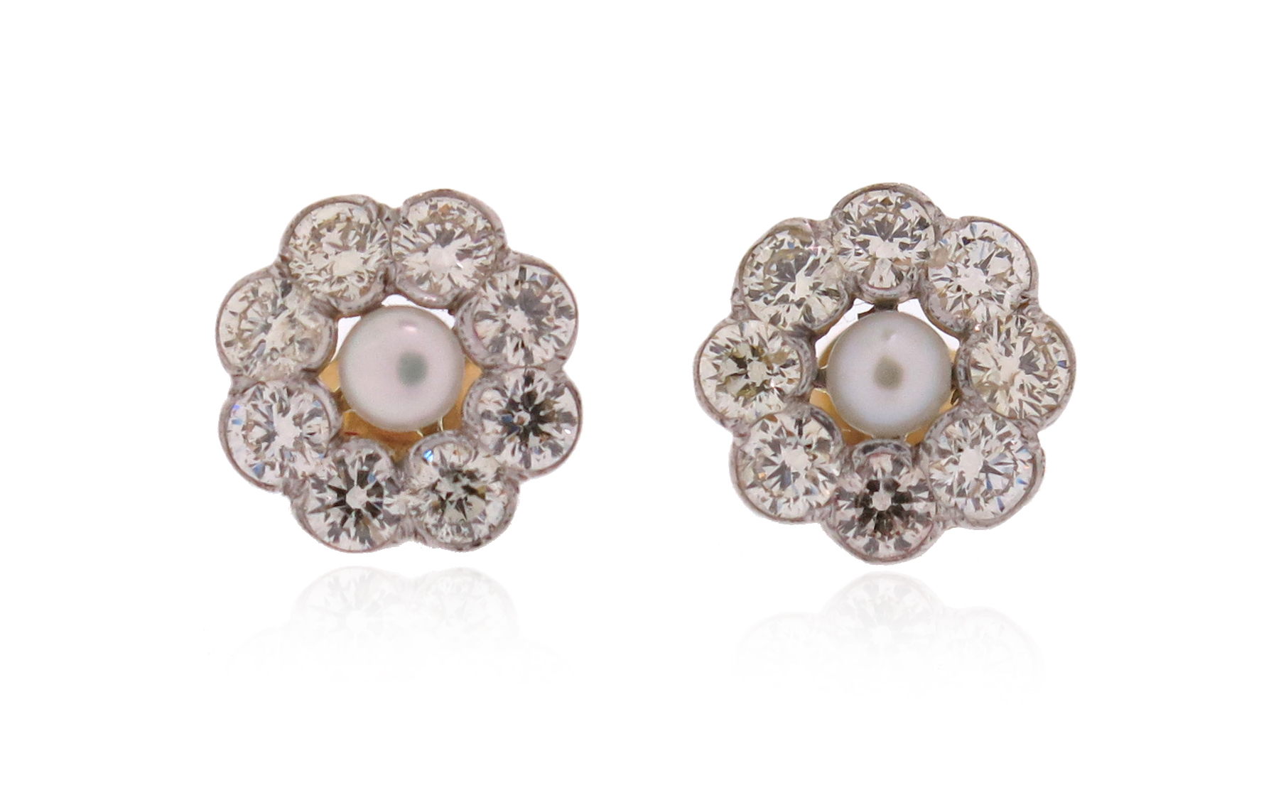 A pair of cultured pearl and diamond earrings, the cultured pearls set within a surround of round brilliant-cut diamonds in platinum and white gold, 11mm wide
