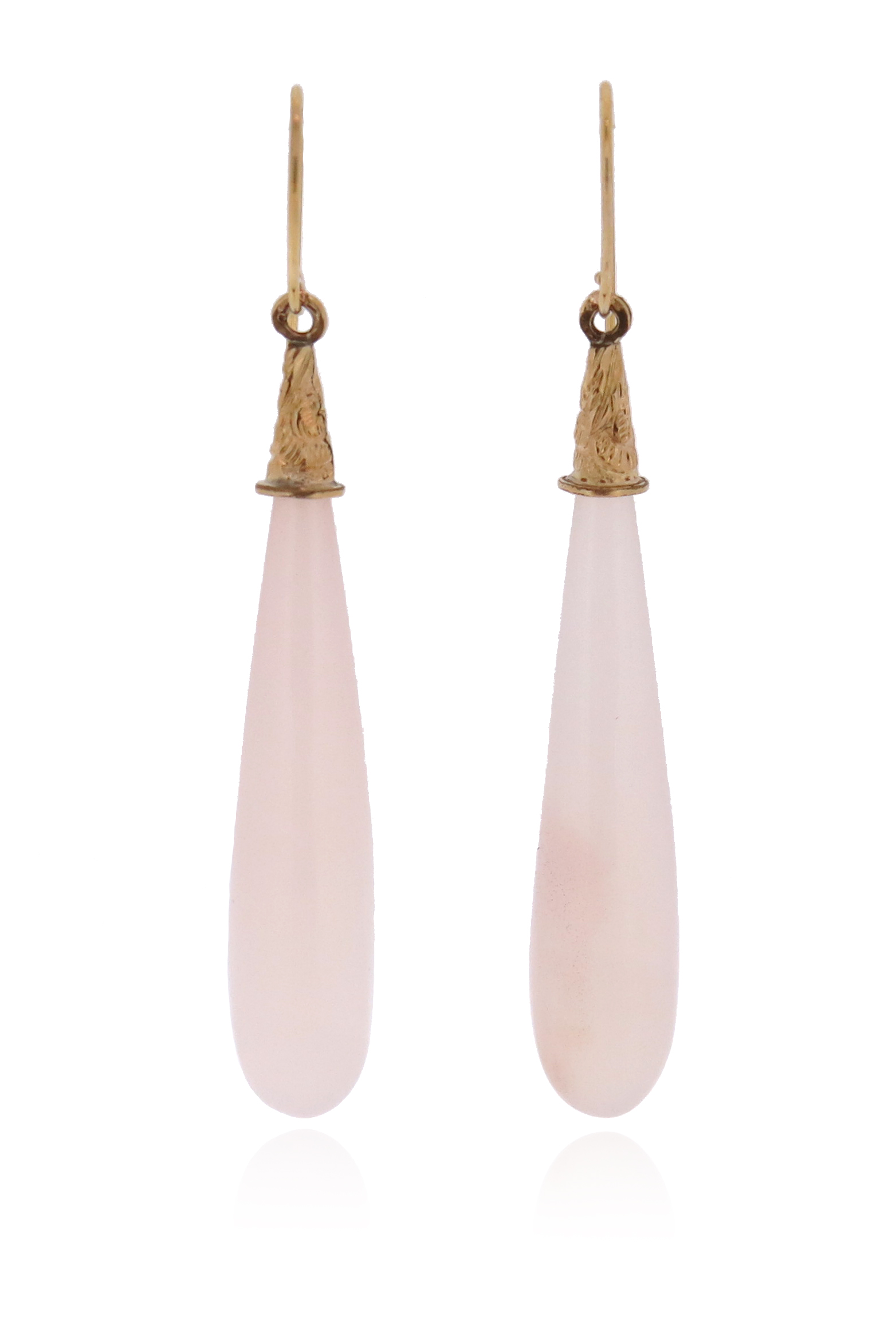 A pair of chalcedony-set gold drop earrings, the elongated chalcedony drops suspend from engraved gold caps, shepherd's hook fittings, 6.3cm high (including fittings)