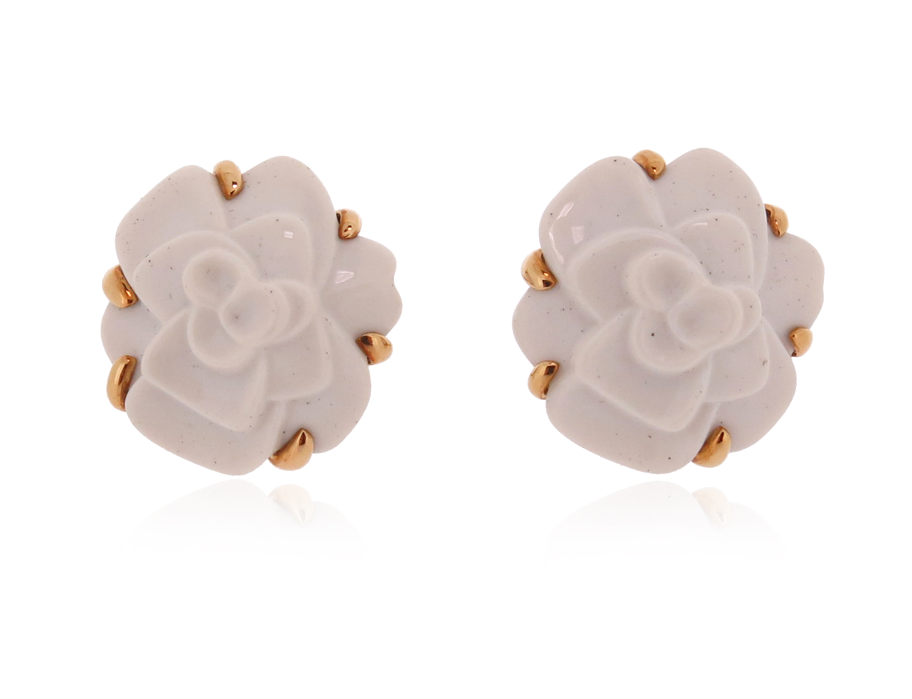 A pair of ceramic flowerhead earrings by Chanel, mounted in 18ct yellow gold, signed and with inventory number 6F308. 2.5cm wide