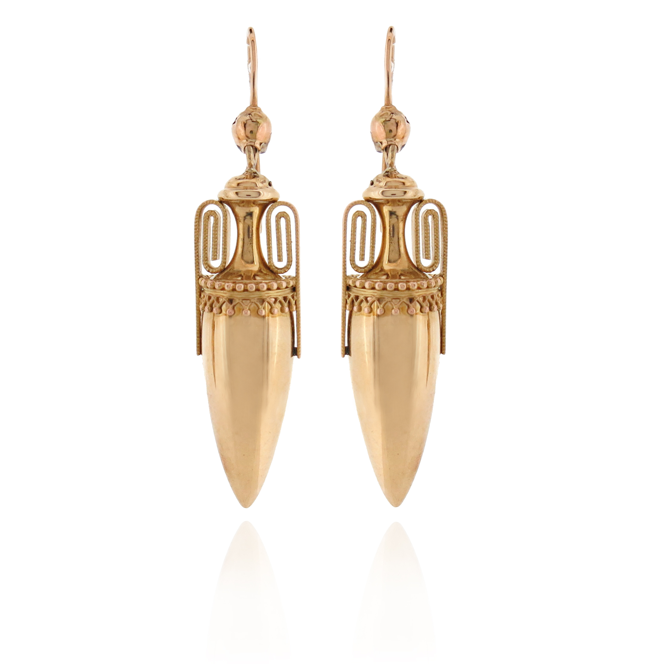 A pair of gold amphora drop earrings, with pellet decoration in gold, shepherd's hook fittings, 5.5cm high