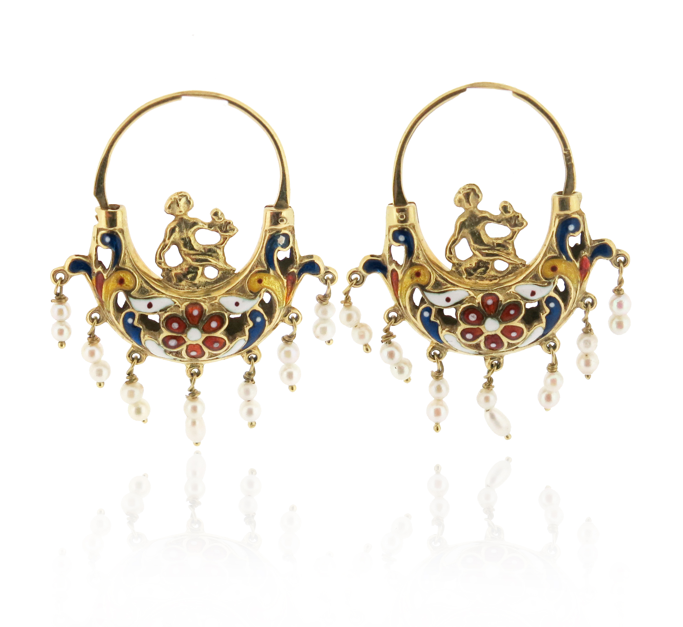 A pair of enamel and gold earrings, designed as stylised putti riding polychrome enamel gondolas suspending cultured pearls in yellow gold, 4.4cm high