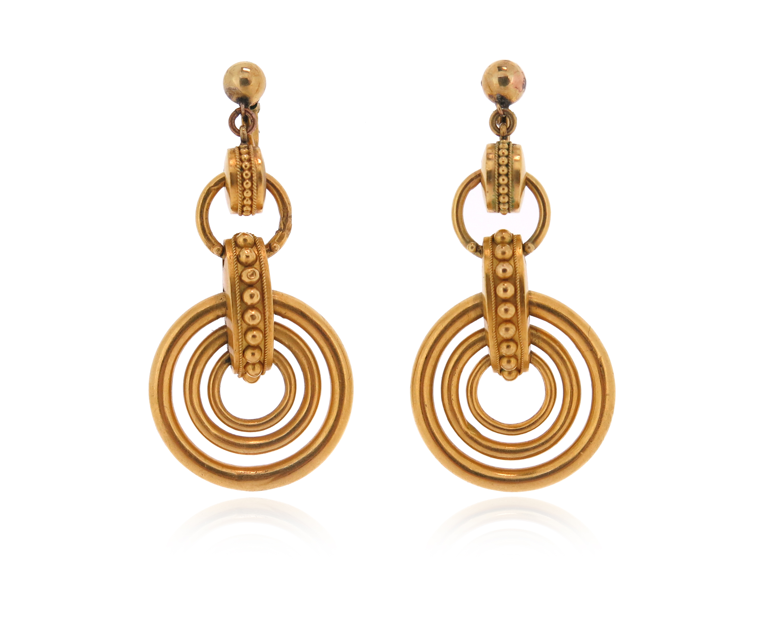 A pair of Etruscan Revival gold earrings, the concentric gold hoops suspend from bars with pellet decoration, 5.2cm high
