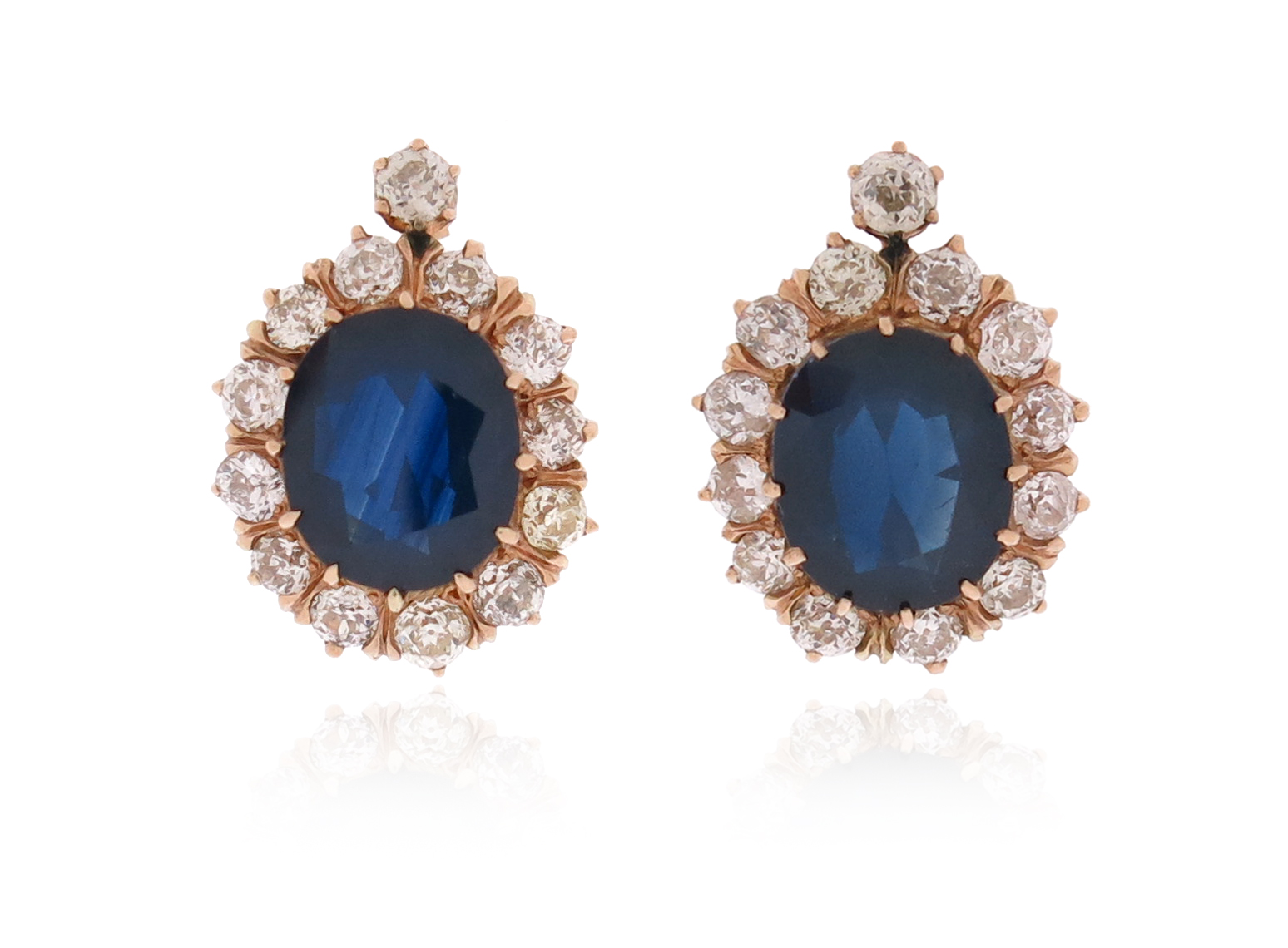A pair of Russian sapphire and diamond cluster earrings, the oval-shaped sapphires set within a surround of old circular-cut diamonds in gold, initialed AT to reverse and 56 zolotnik, 2.1cm high