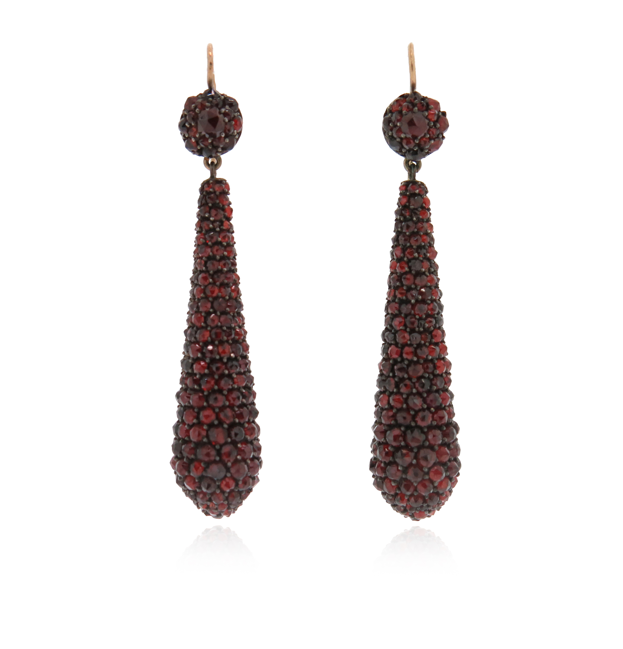 A pair of Victorian garnet drop earrings, the drop earrings pave-set with rose-cut garnets, suspended from a rose-cut garnet cluster in gold, shepherd's hook fittings, 6cm long (including hooks)