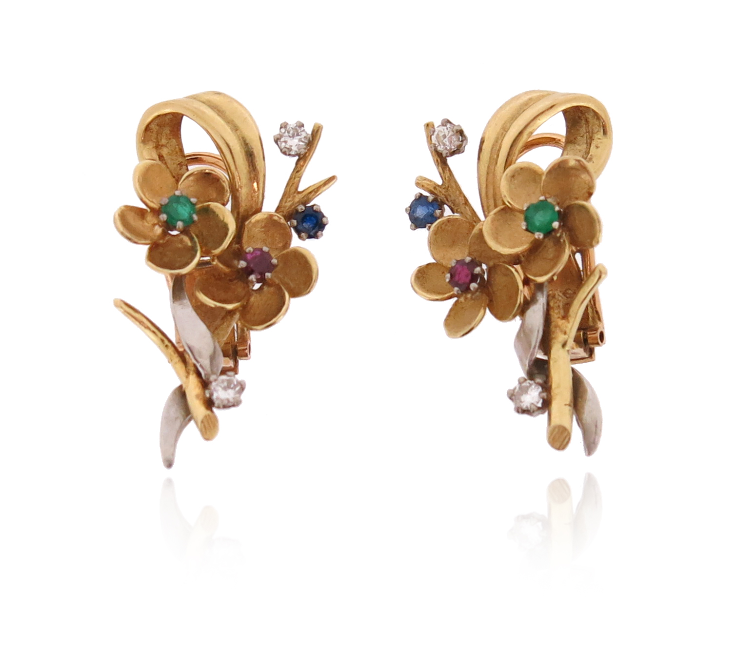 A pair of foliate earrings, each set with diamonds, an emerald, ruby and sapphire in yellow and white gold 3.5cm high