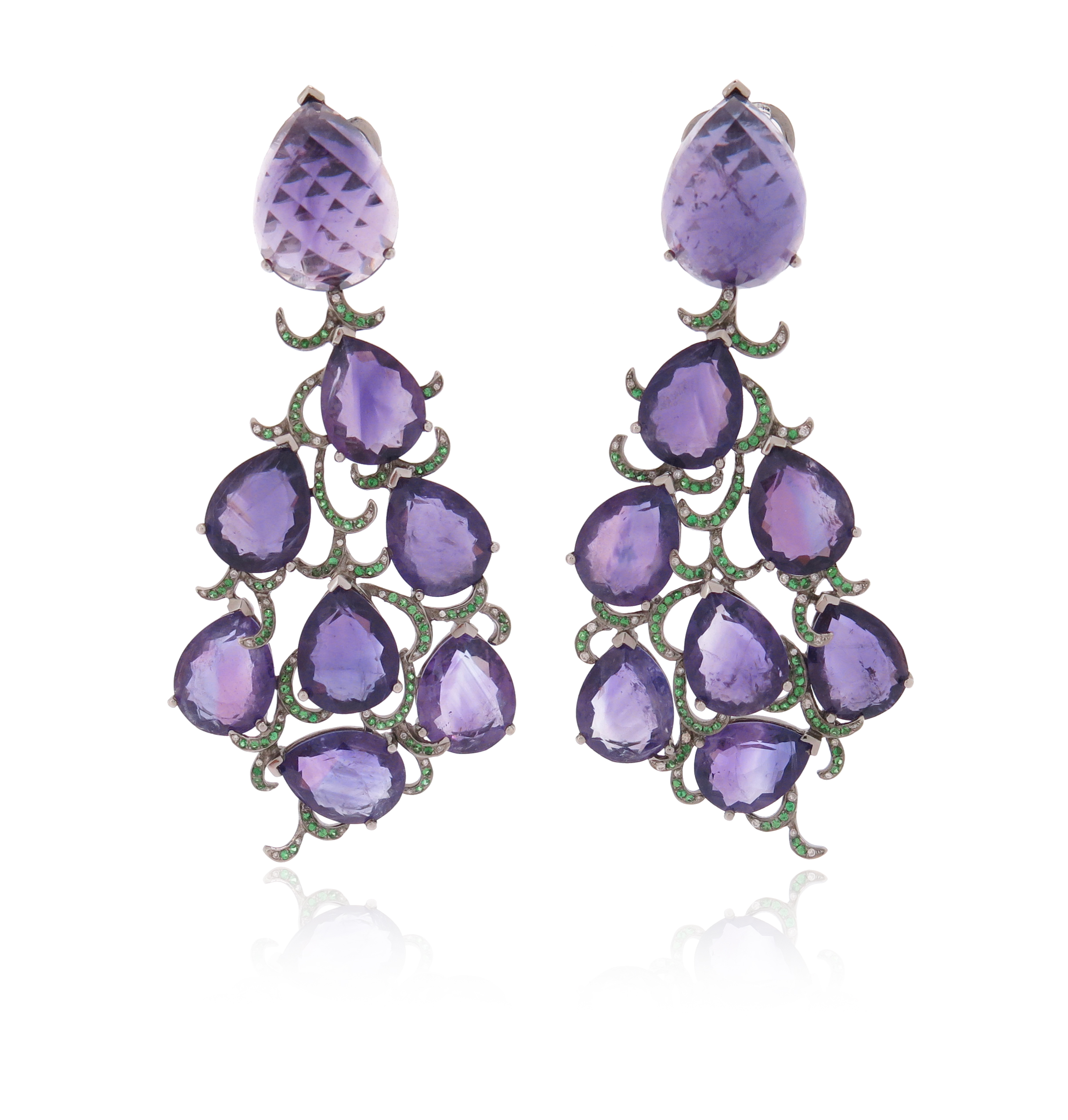 A pair of amethyst, diamond and tsavorite-set 'Whispering Chandelier' earrings by Fei Liu, set with pear-shaped amethysts, round brilliant-cut diamonds and circular-cut green garnets in white gold, swinging lower sections, 18ct Birmingham hallmarks, signed FL, 8cm high
