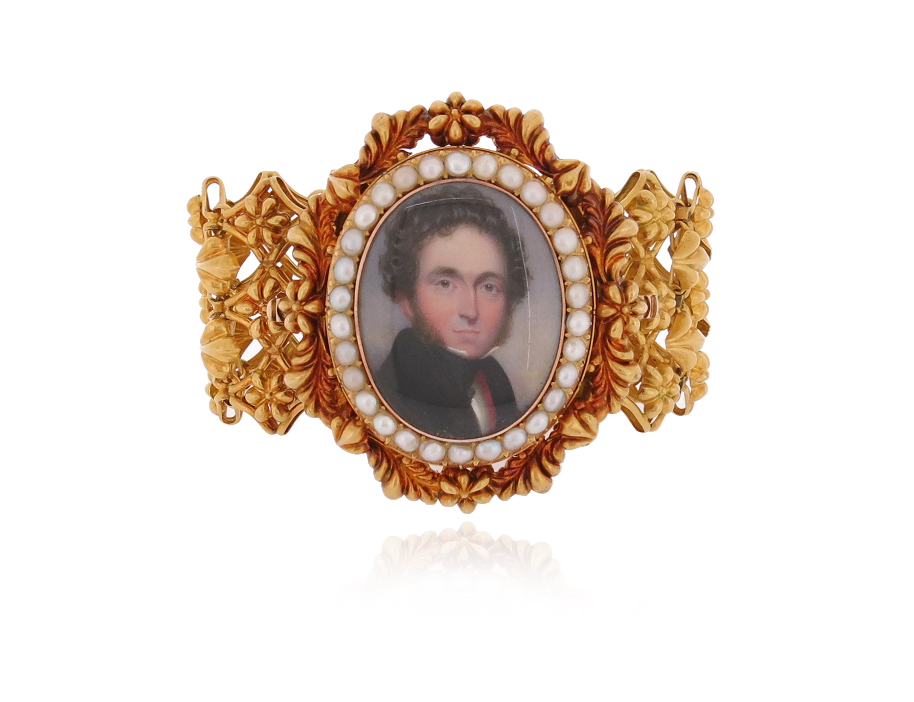 A Victorian gold miniature bracelet, the repoussé gold bracelet with a seed pearl and gold detachable clasp set with a portrait miniature of a gentleman, in glazed compartment with hair to the locket interior, 18.5cm long, miniature frame 5.8cm high