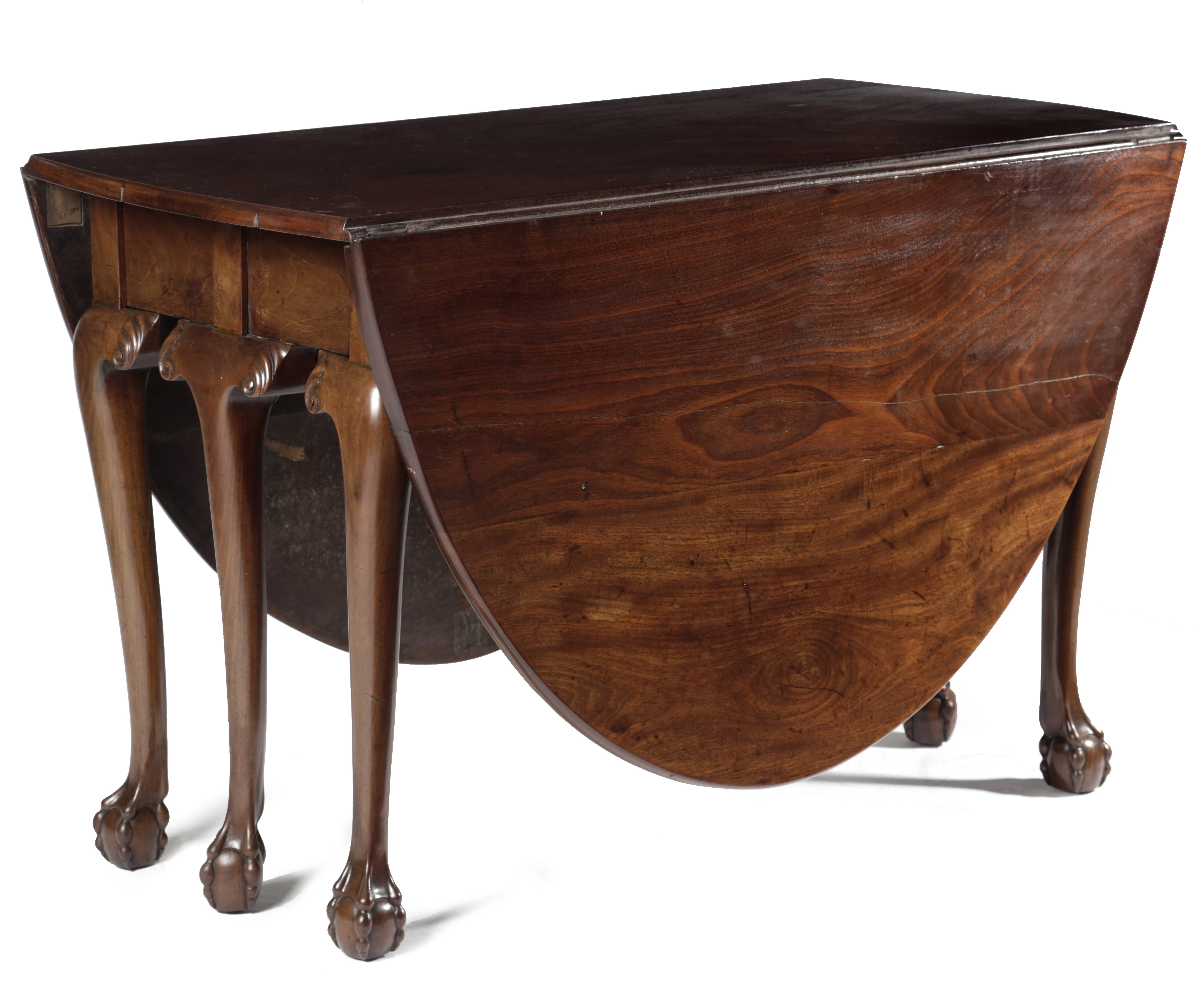 the oval drop-leaf top on six scroll carved club gatelegs and claw and ball feet