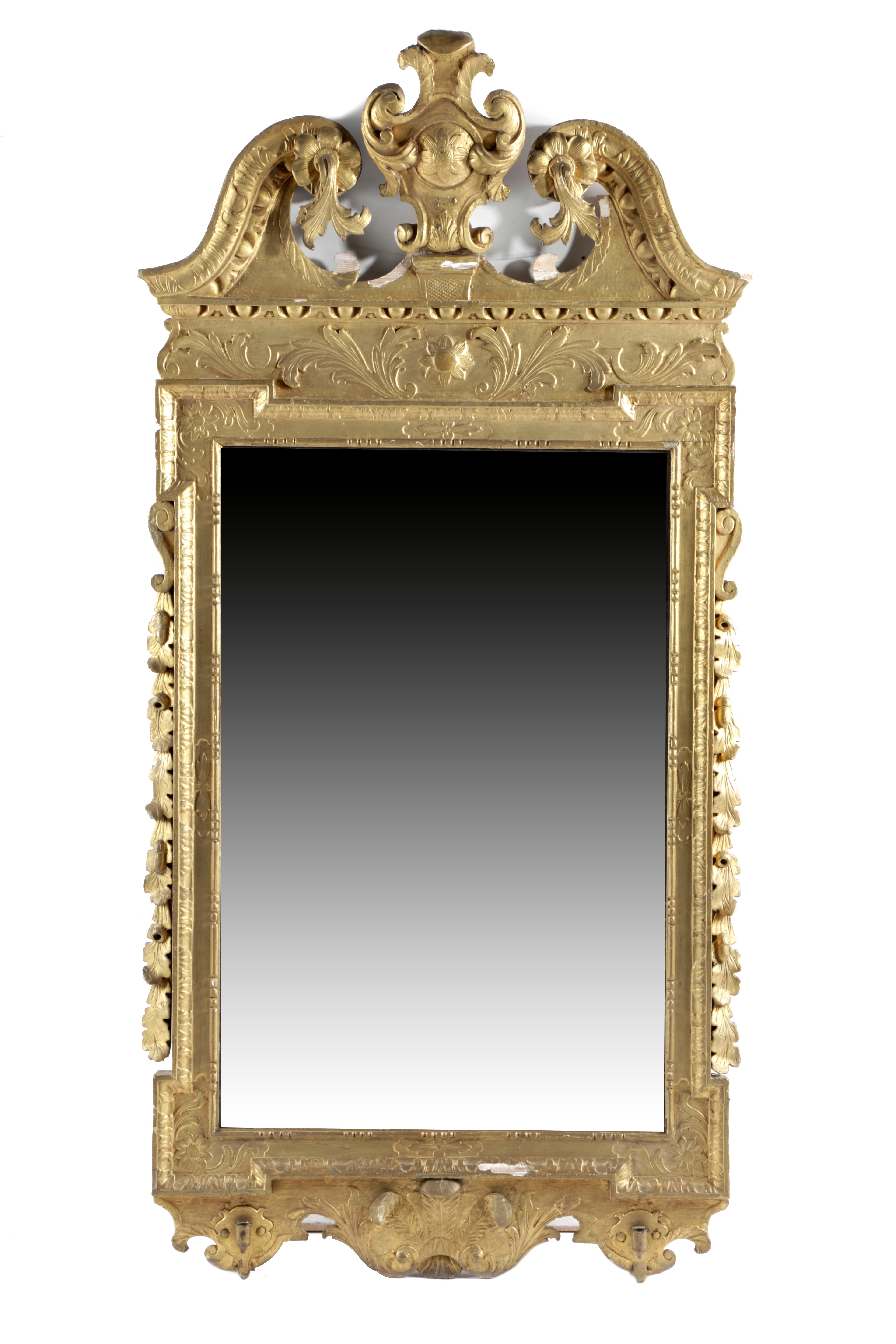 the later rectangular bevelled plate within a baton and bead slip and a leaf and flowerhead carved Kentian frame, with applied scroll, oak leaf and acorn garlands, with a swan neck pediment centred with a cartouche, the base with plumes of feathers and gilt brass candle sconces