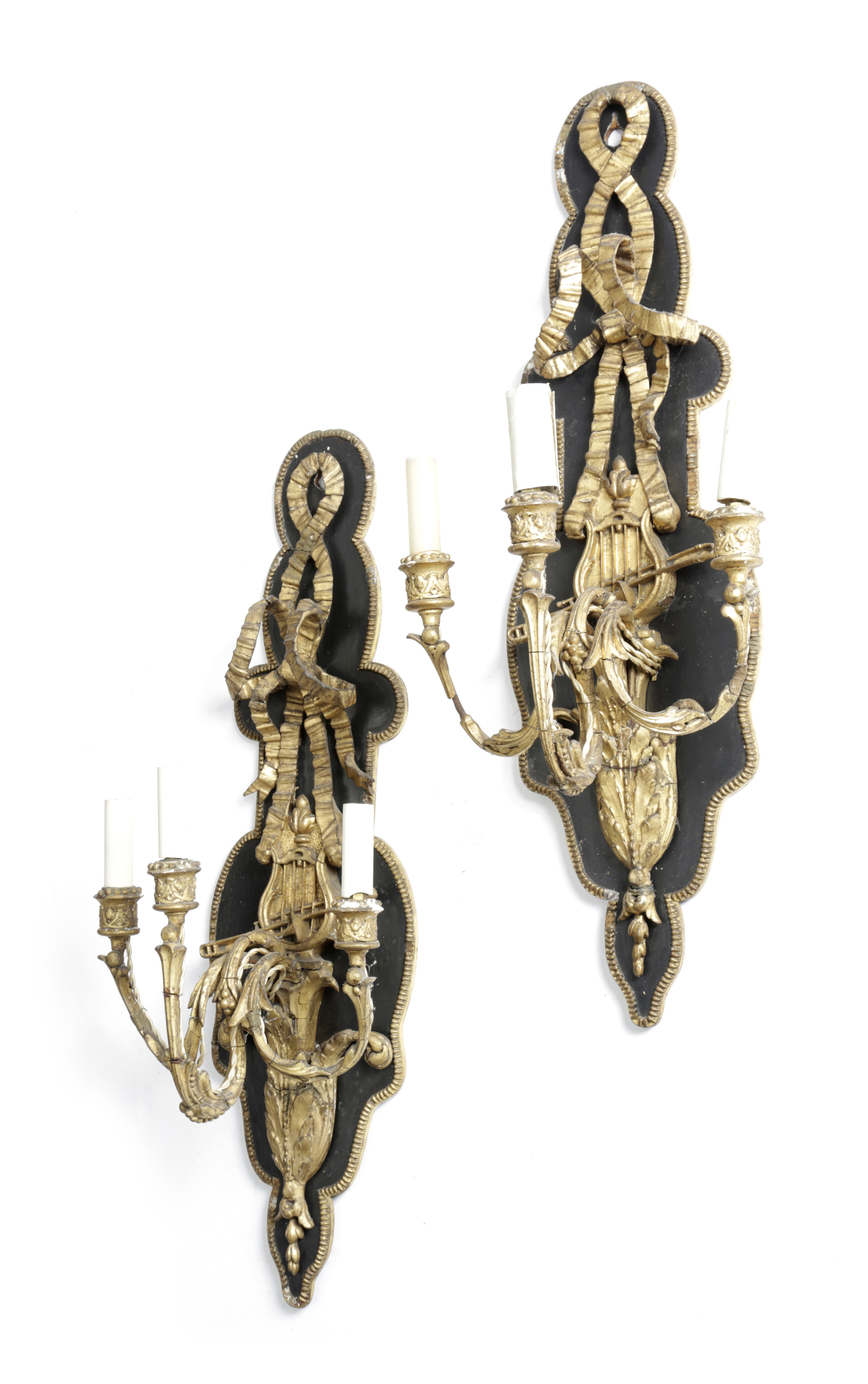 each with a ribbon backplate above musical trophies and with three leaf scroll arms above a leaf base, on an ebonised wood back, with a nulled moulding (2)