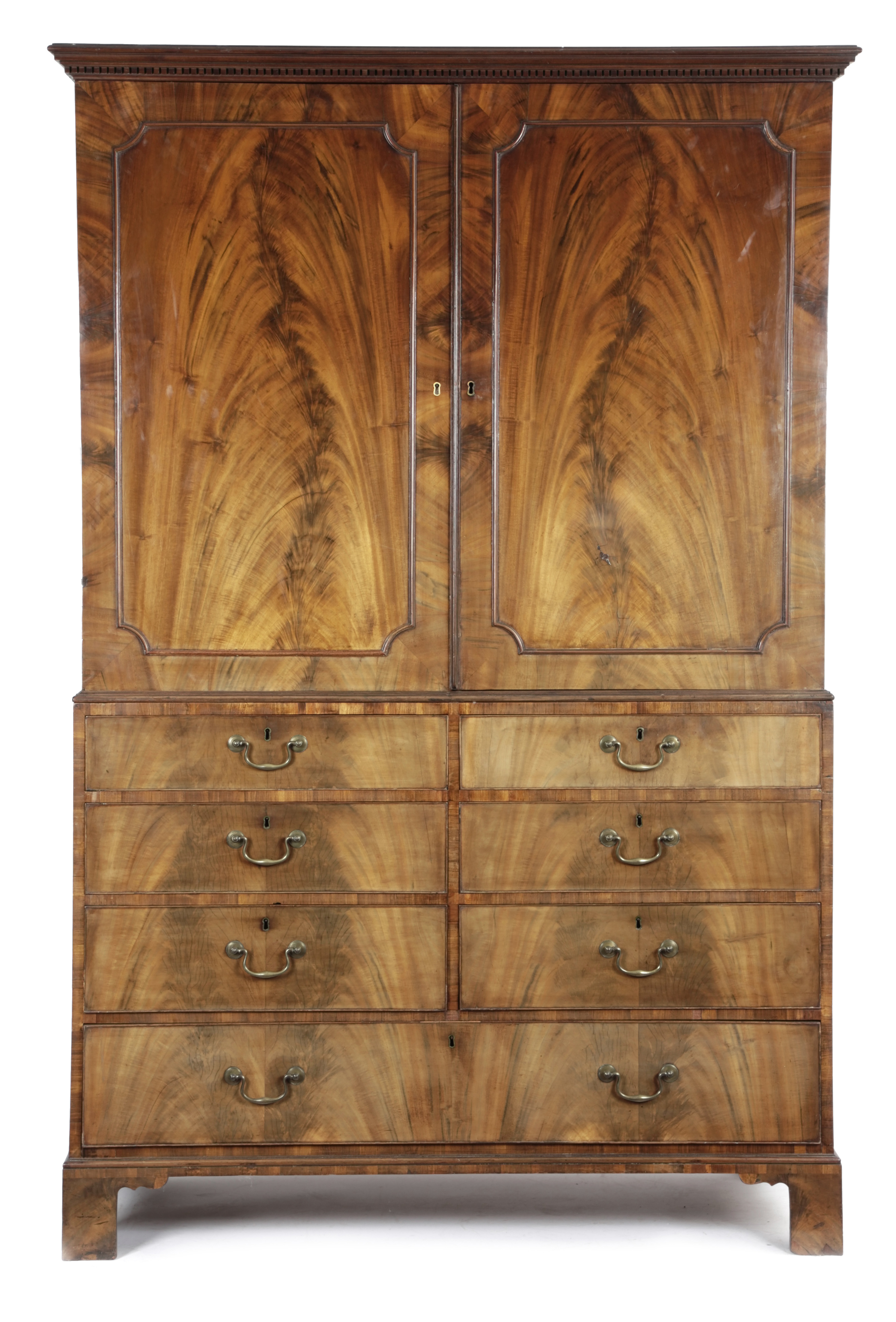 the detachable dentil cornice above a pair of flame mahogany doors with outline mouldings, enclosing a long slide and two short slides, the base with six short drawers and one long drawer, on bracket feet