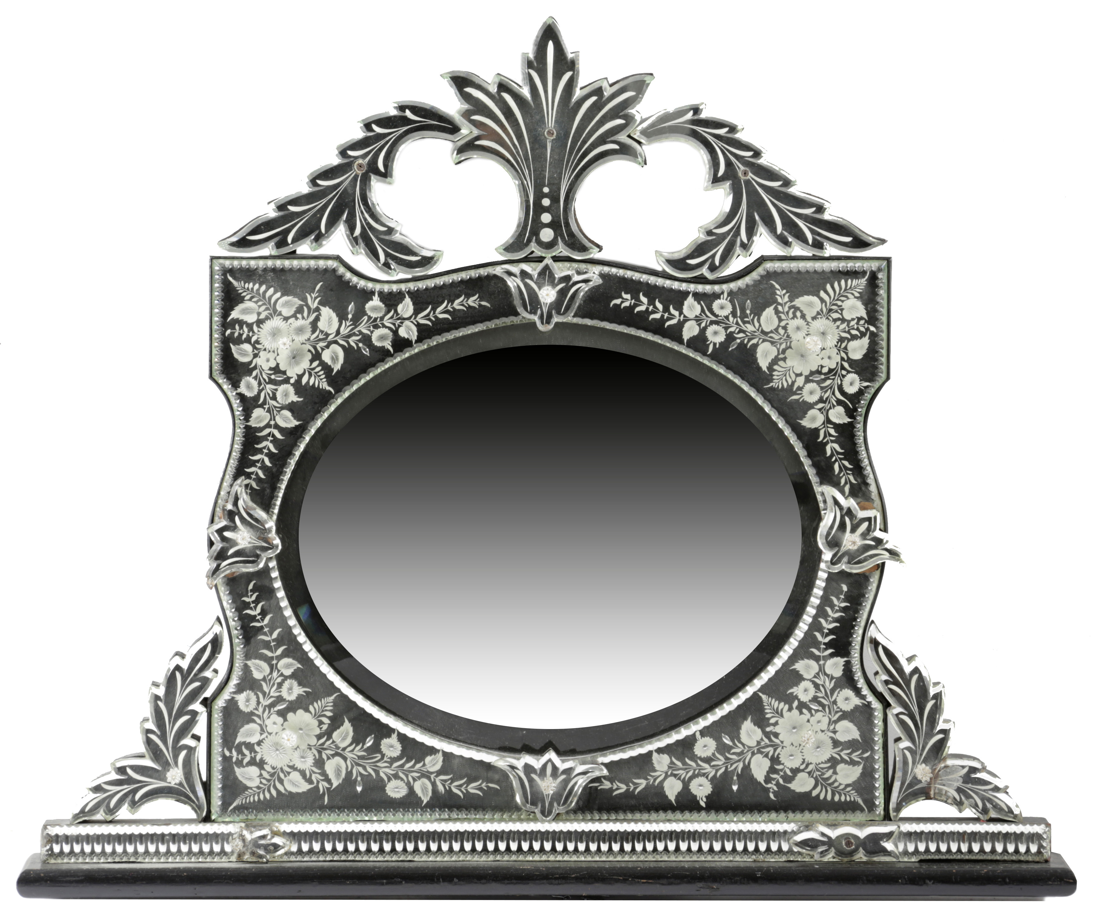 with a central oval bevelled plate, within a circular cut outer frame etched with flowers and leaves, with a scrolling leaf surmount and applied with flowerheads, the back with a later easel to use as a dressing table mirror