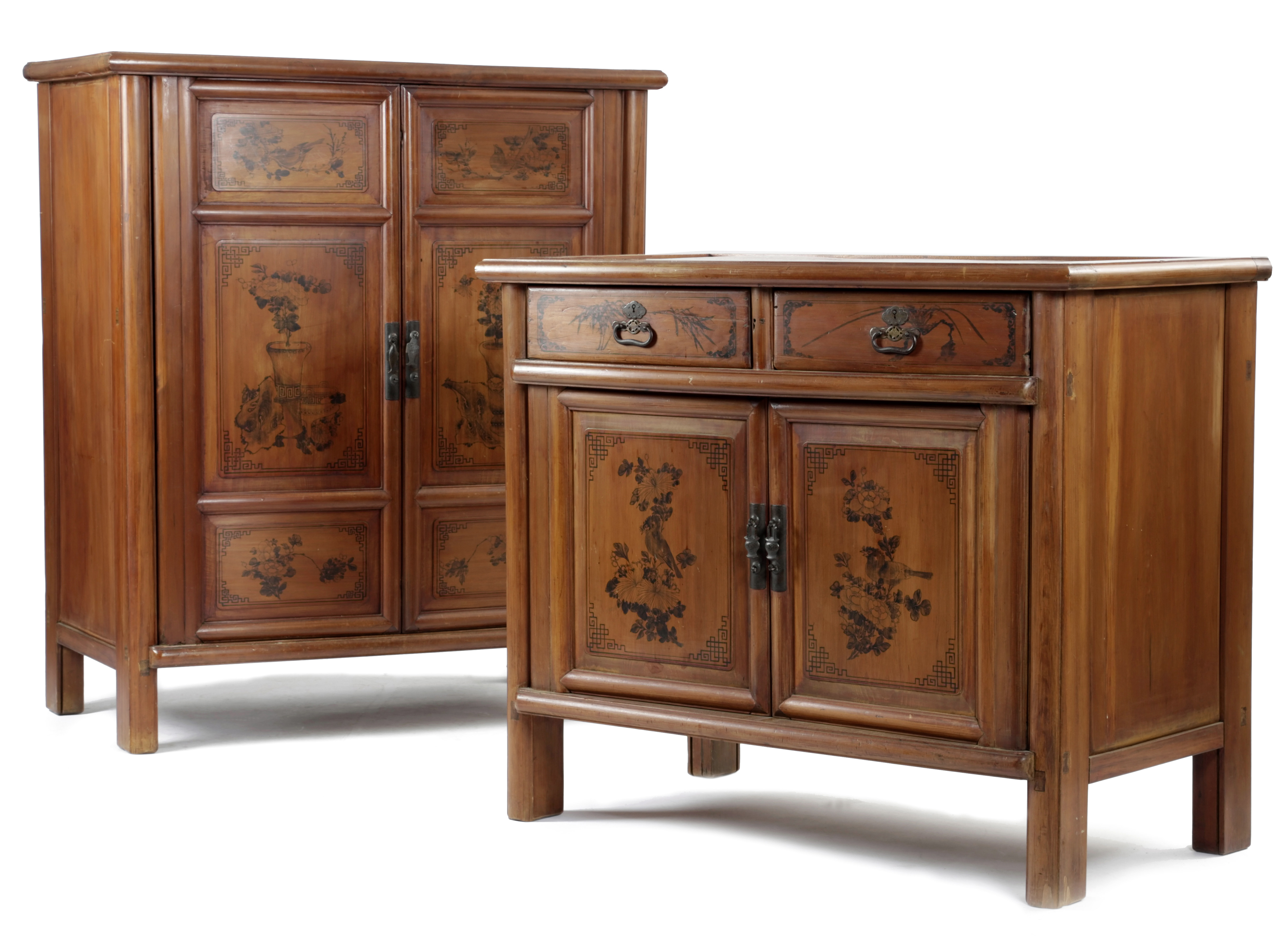 decorated in ink with panels of birds, vases of flowers and bamboo, one with a pair of panelled doors enclosing an interior with a shelf and two drawers, the other with a pair of drawers above a cupboard (2)