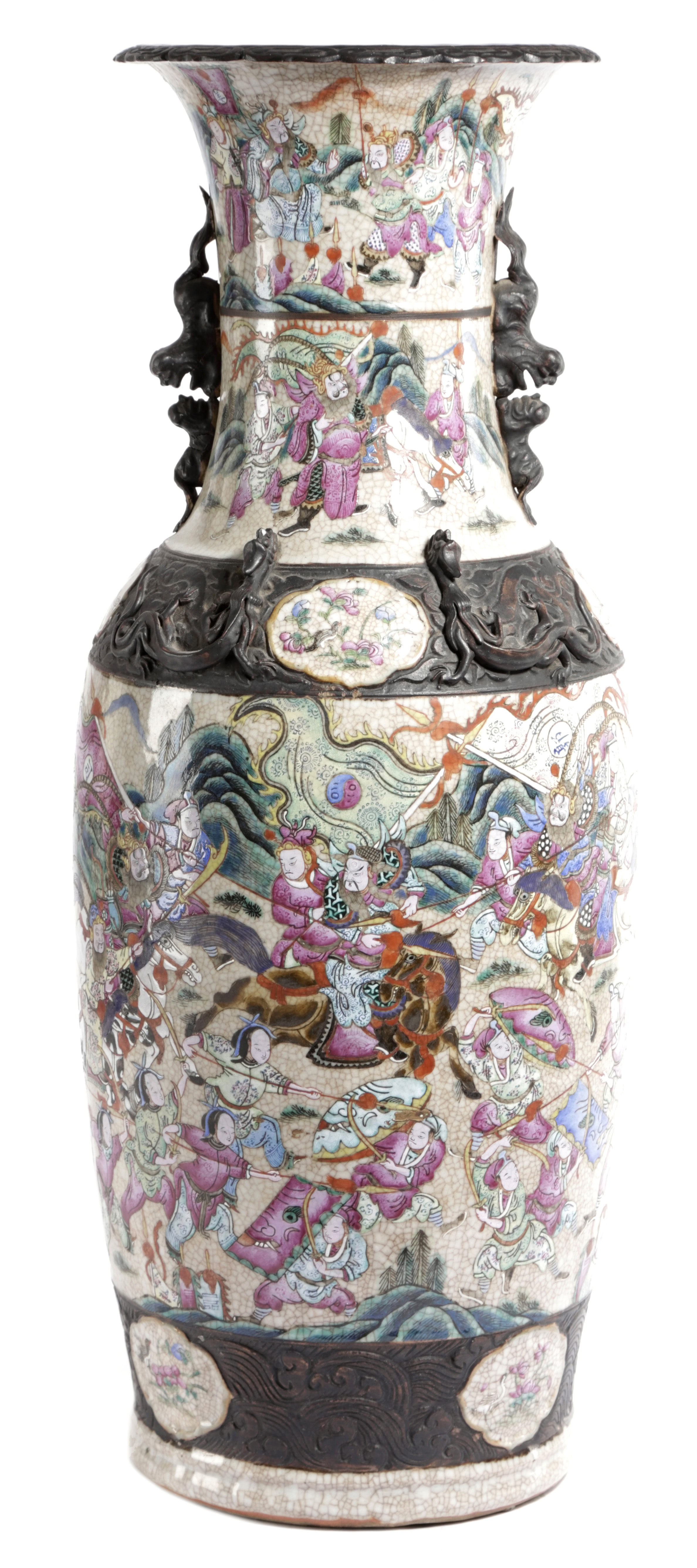 with a crackle glaze and decorated with famille rose enamels with battle scenes of warring figures in mountainous landscapes, applied with chilong