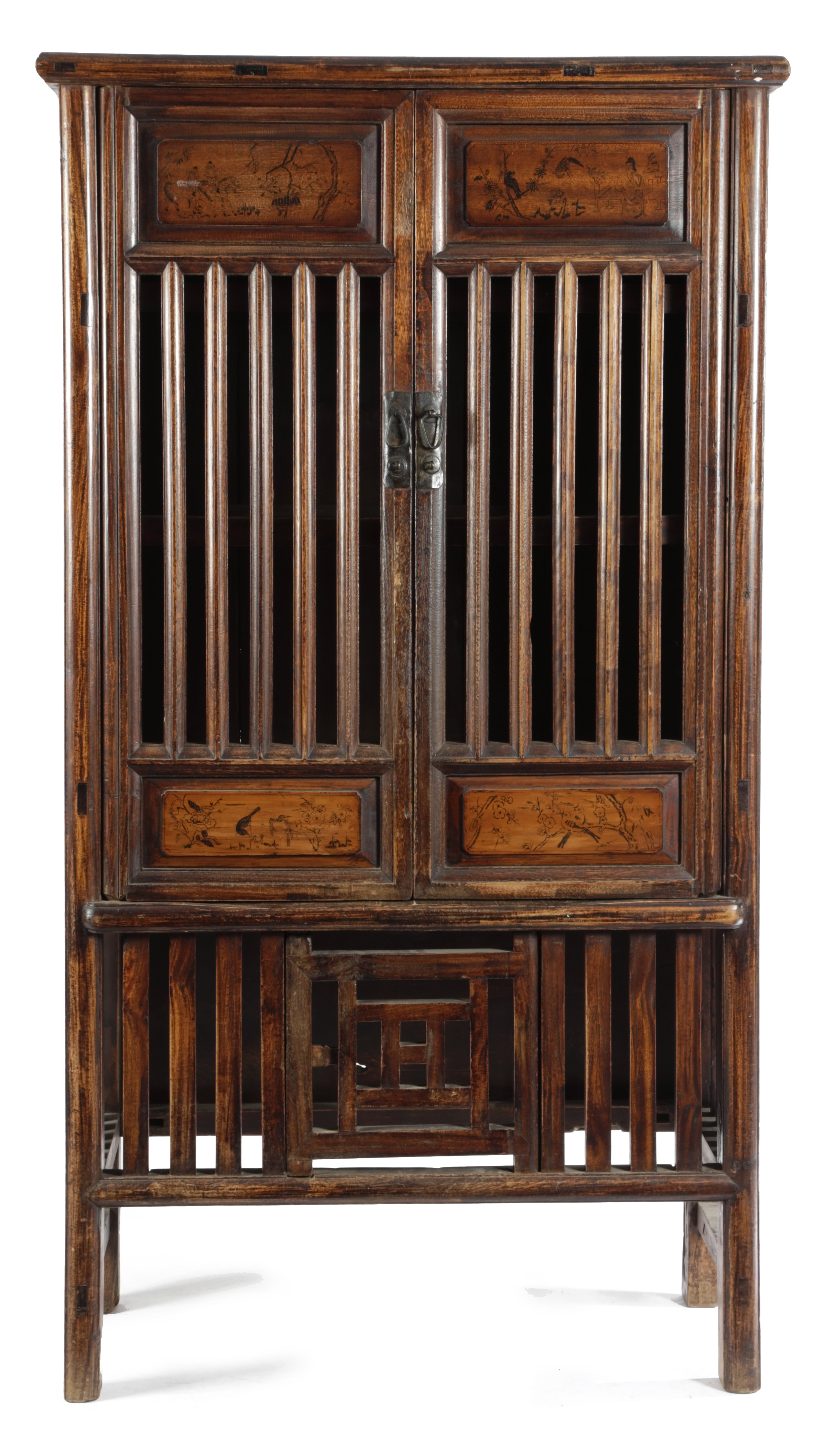 with four raised panels, ink decorated with figures on horseback, birds perching in prunus trees and other figures, with a pair of open slatted doors enclosing two drawers, above a conforming base