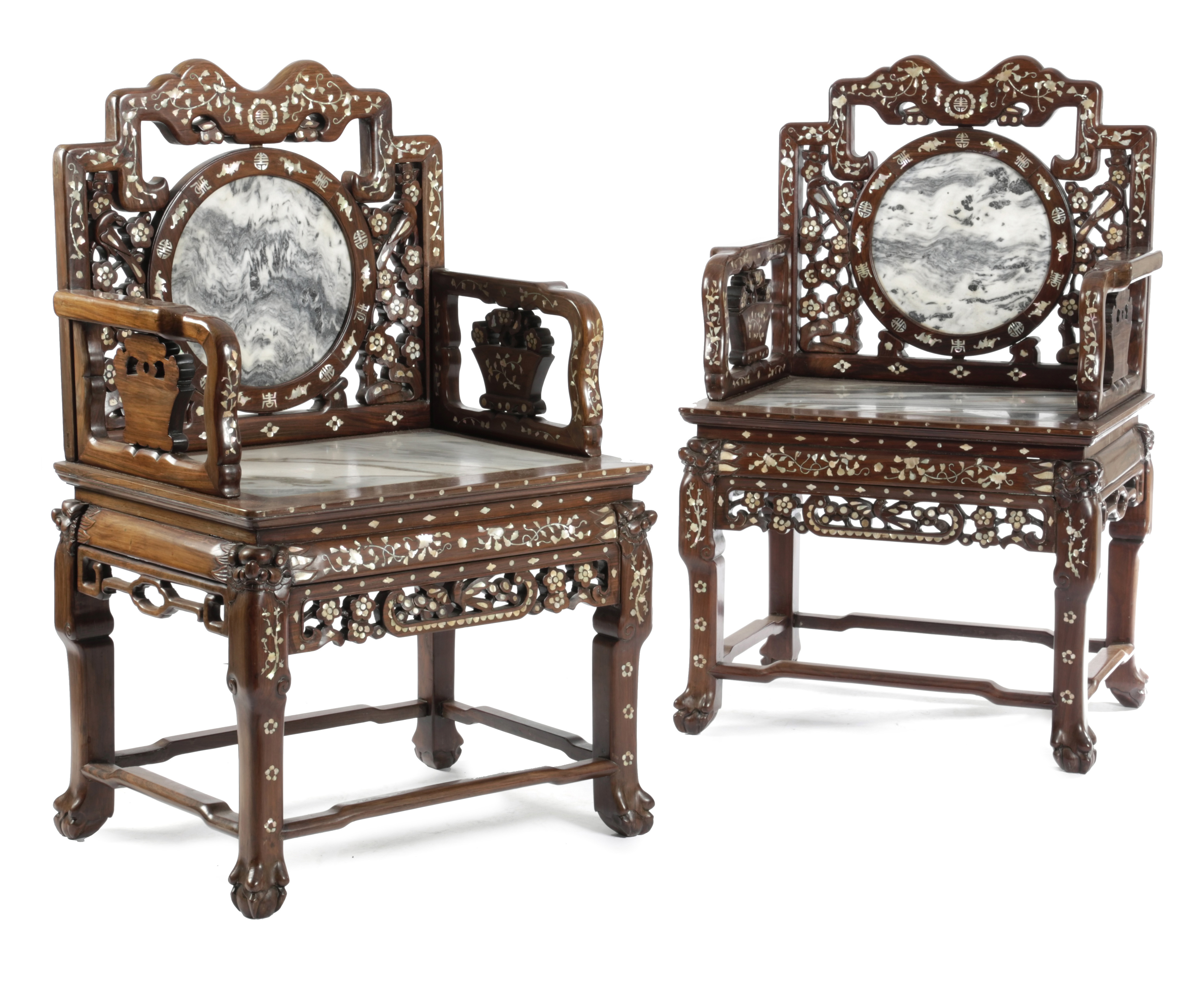 inlaid with mother of pearl, with scrolling leaves and auspicious shou characters with bats, the carved backs decorated with prunus trees and birds, each with a circular marble 'dreamstone' panel back and seat, above a pierced frieze, on mythical beast carved legs and claw and ball feet (2)