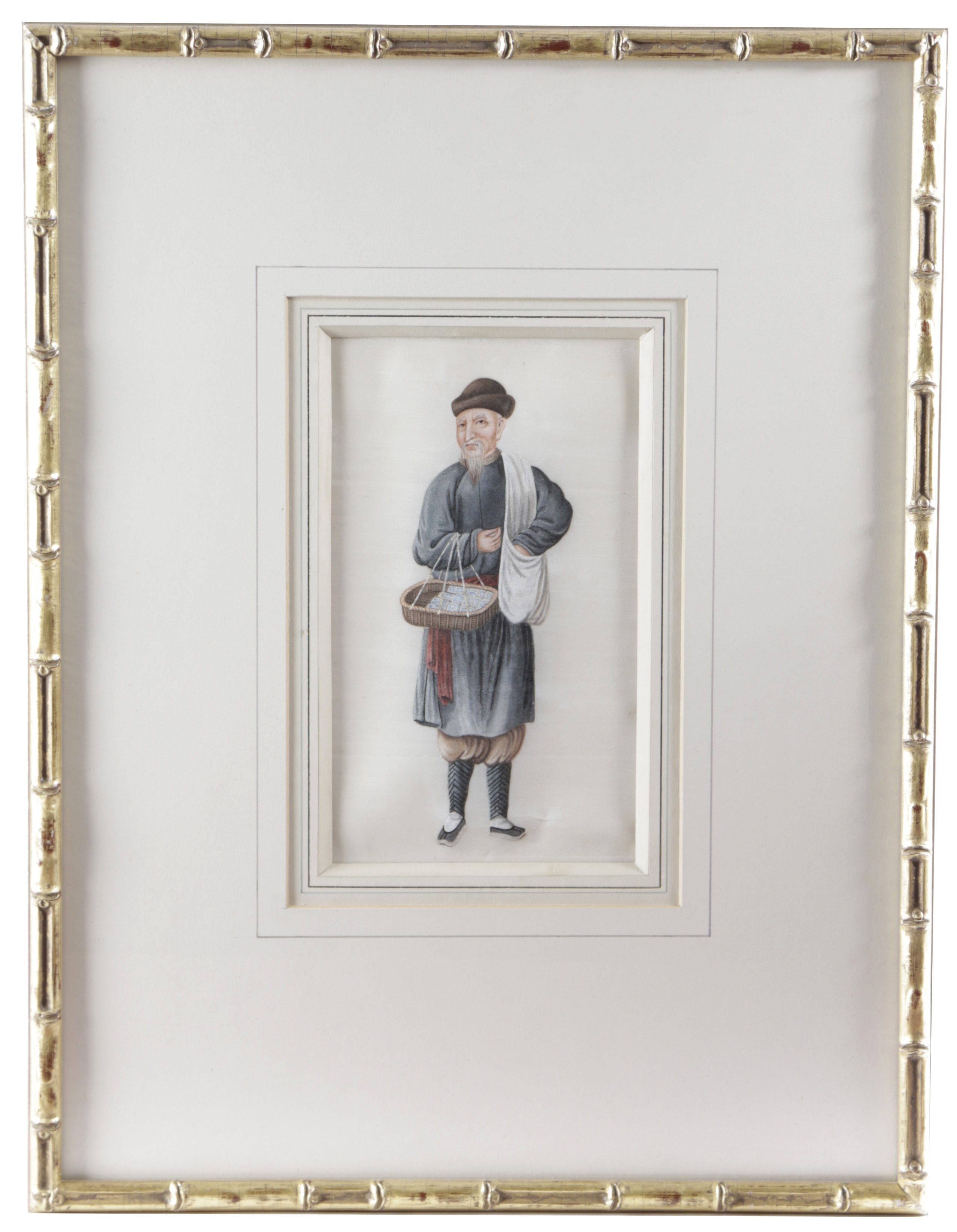 depicting various courtly figures, including a man with a ruyi sceptre and a lady playing a lute, all mounted in faux bamboo gilt and glazed frames (7)
