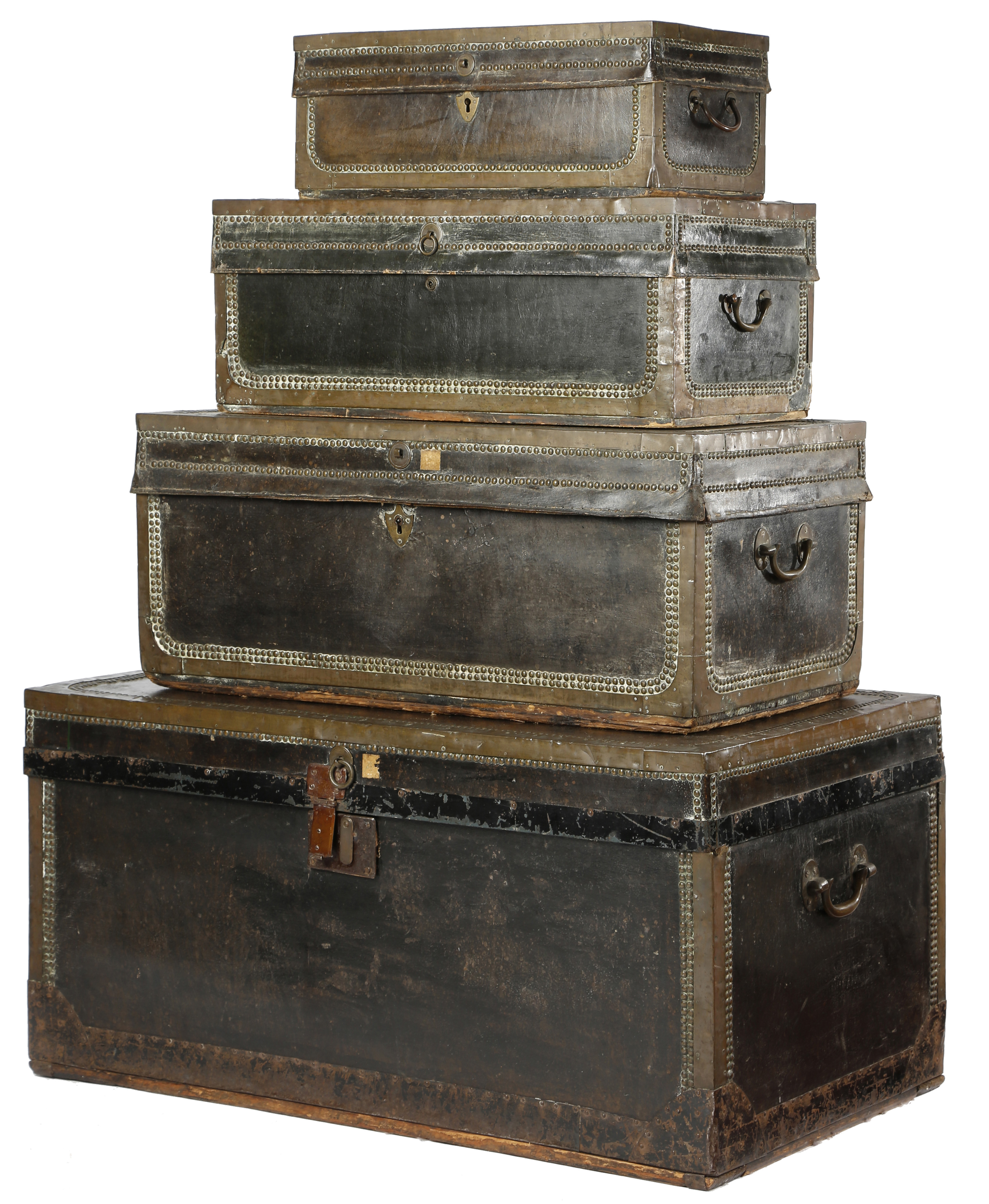 each covered in green leather, with brass edging and studded decoration, with side carrying handles (4)