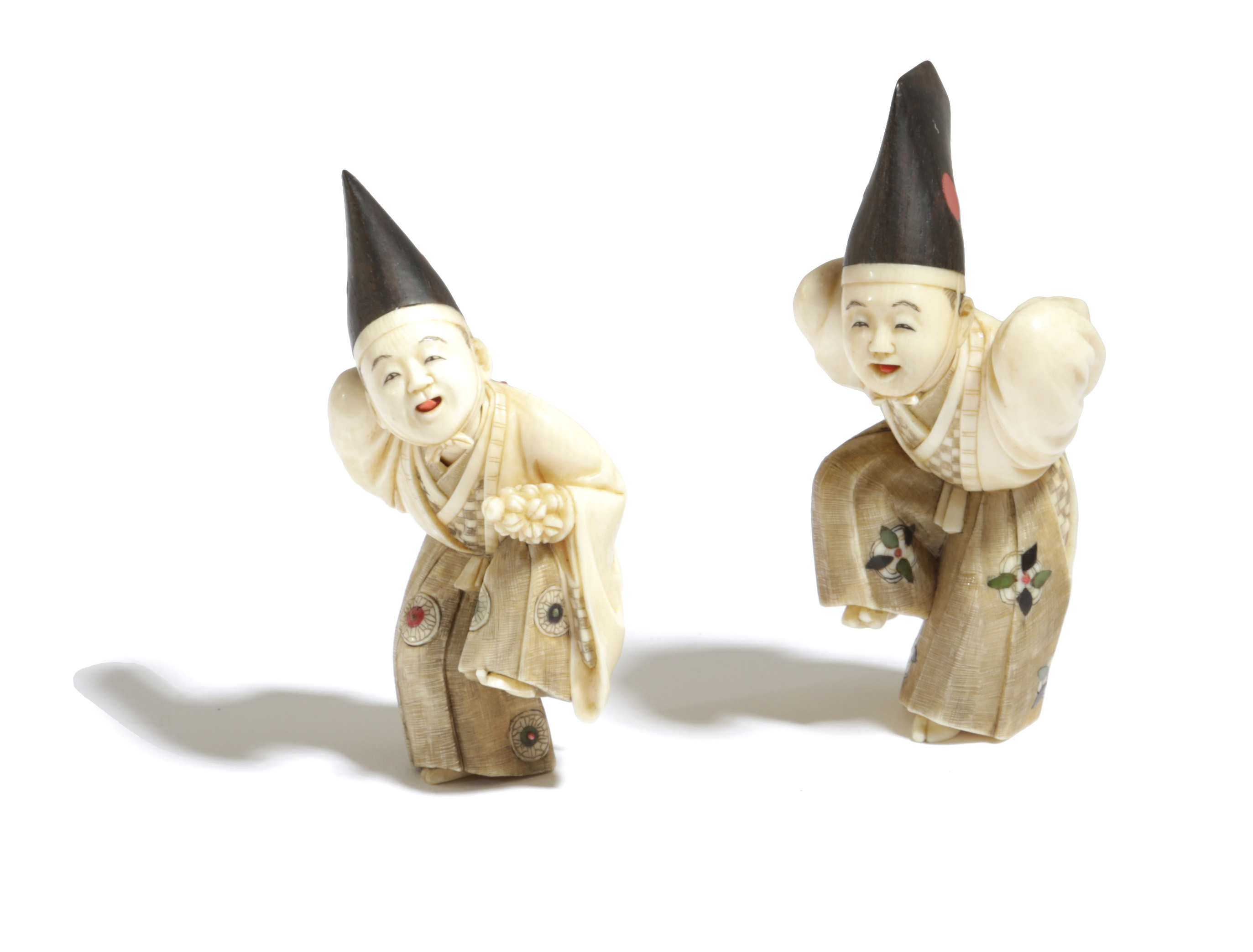 λ A PAIR OF JAPANESE WOOD, LACQUER AND IVORY NETSUKE