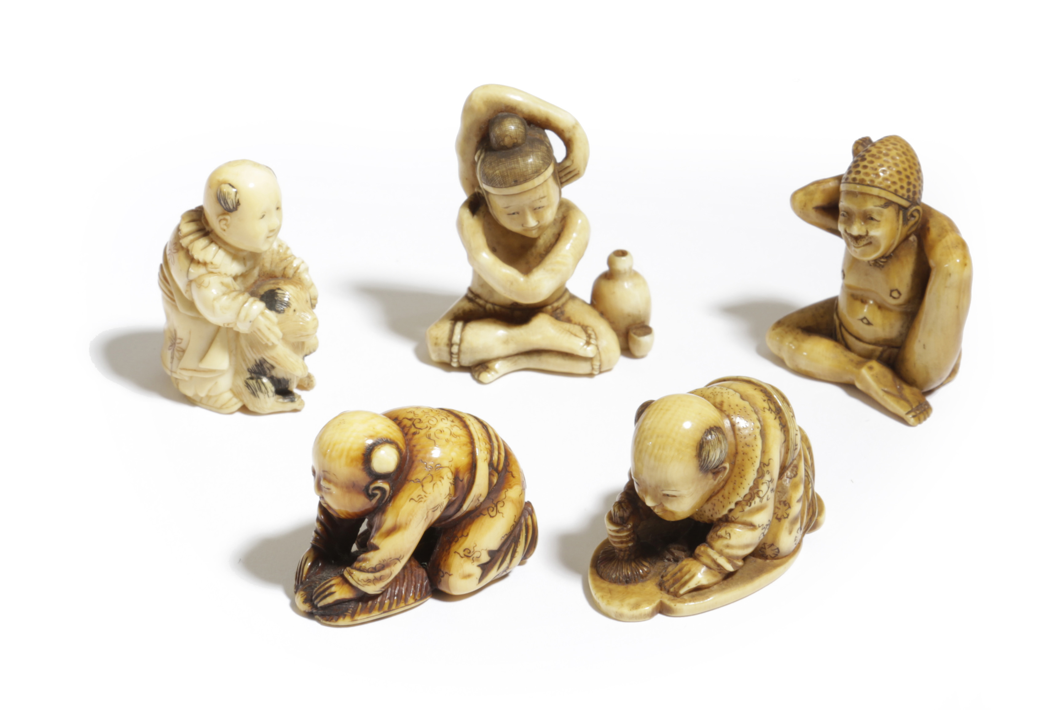 three carved as boys: one drawing a large character on the floor, possibly kokoro for 'heart', signed 'Tomochika', another catching a butterfly underneath his fan and the third in marine ivory with a dog, together with two netsuke of men contorting, one signed 'Yuho', some with paper collection labels (5)