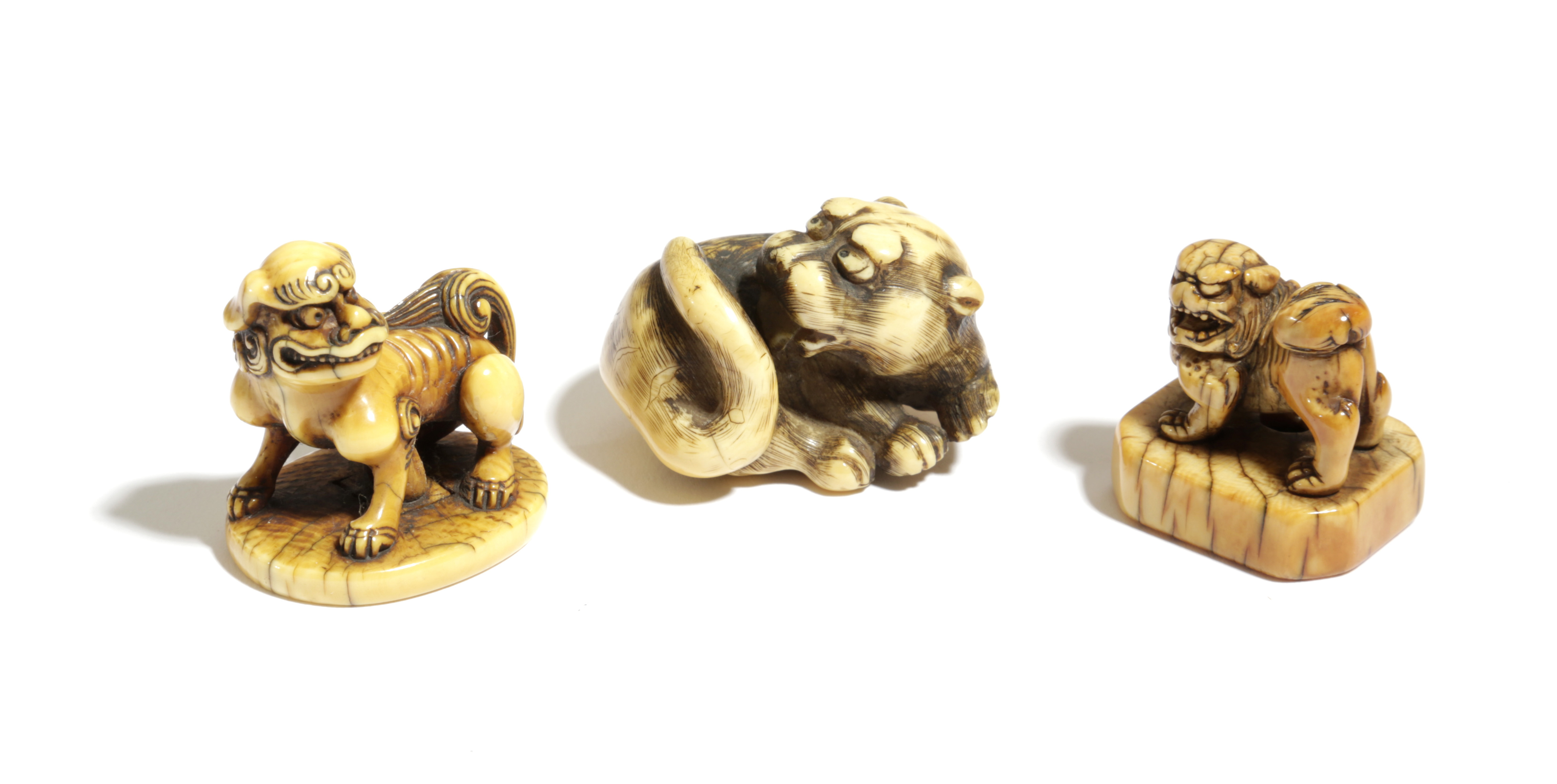 one carved as a reclining tiger licking its back, the other two depicting lion dogs standing on bases, one a seal cut with three characters underneath, the other with a paper collection label reading 'G 232' (3)