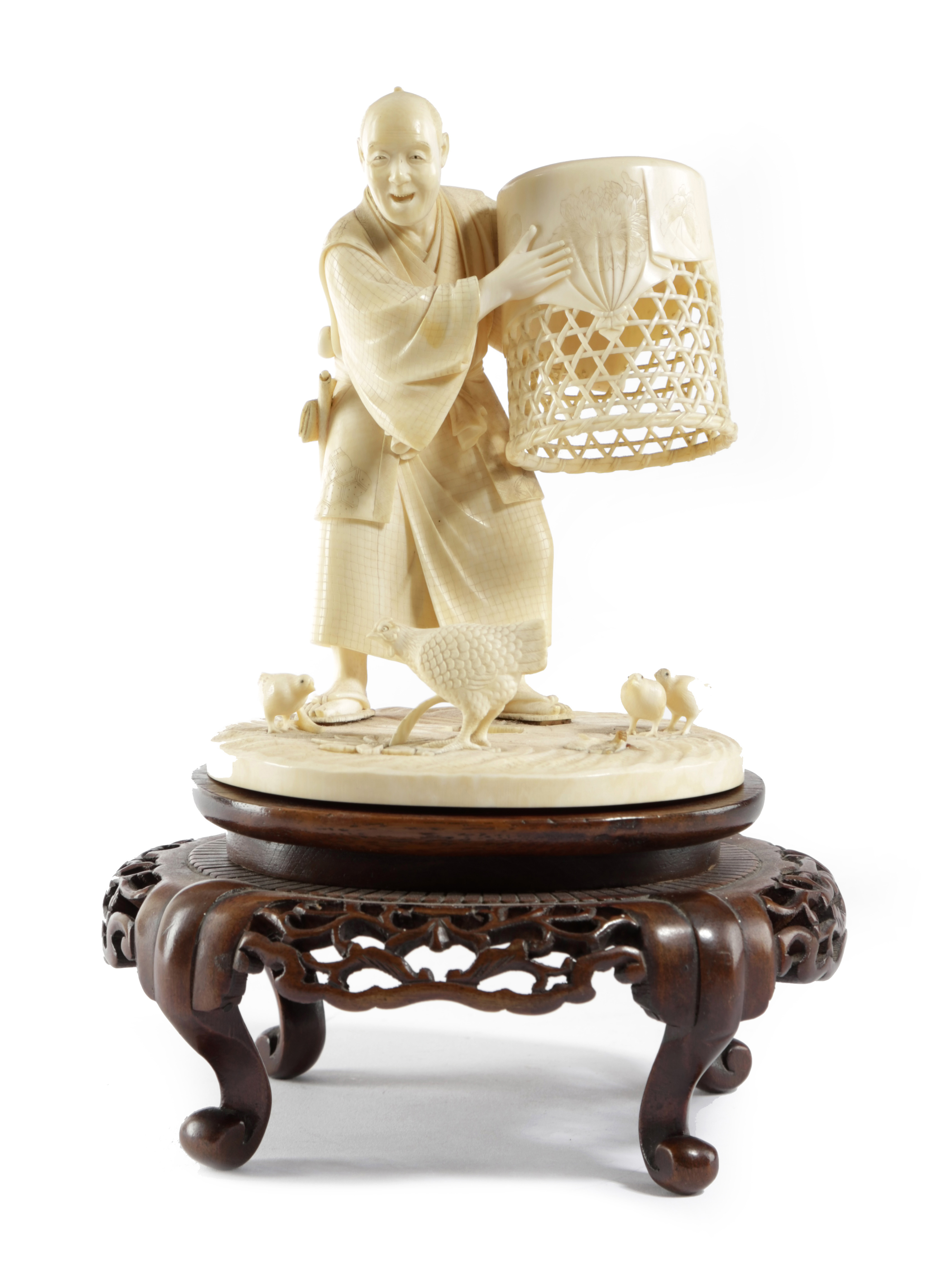 λ A JAPANESE IVORY OKIMONO GROUP OF A CHICKEN CATCHER
