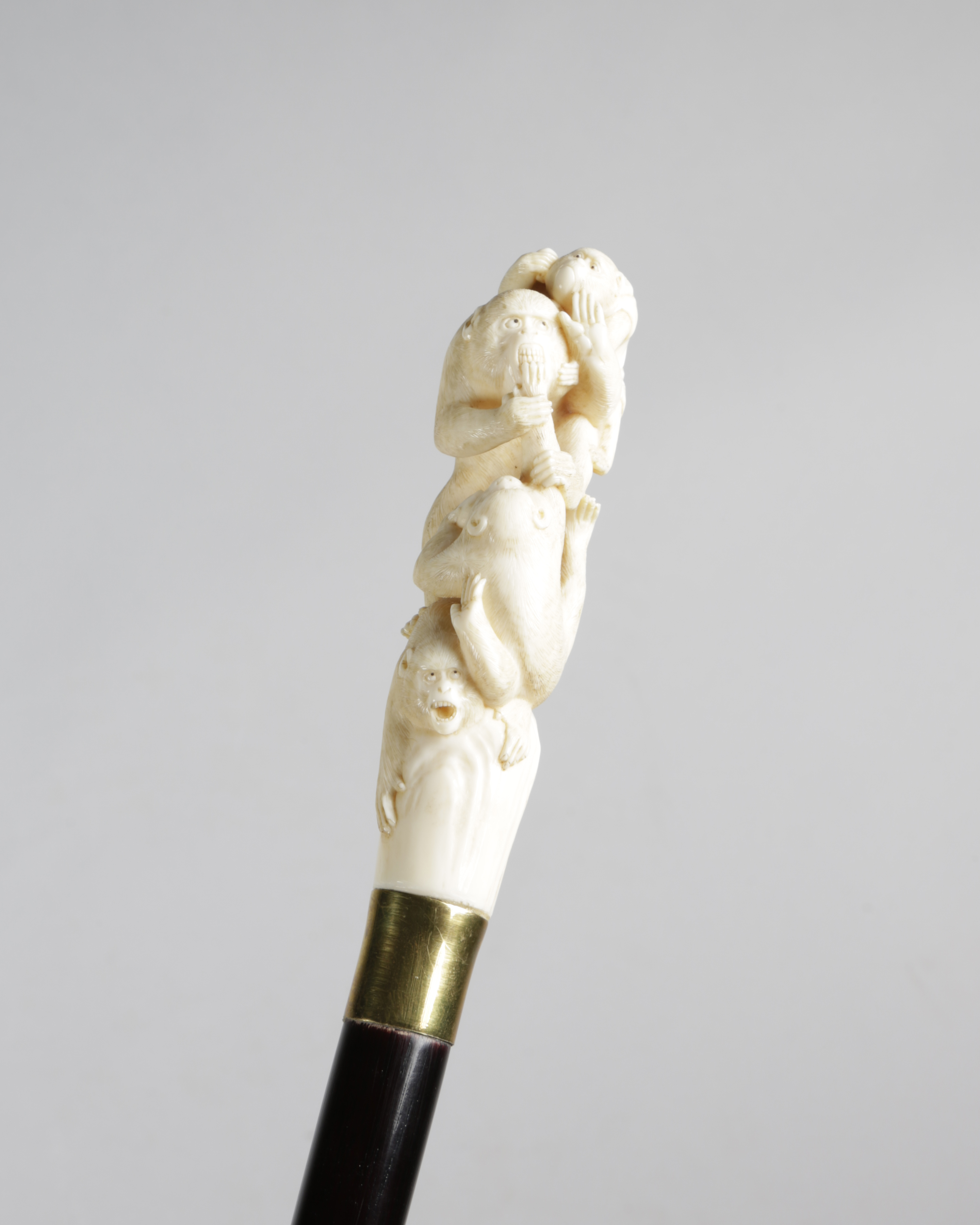 carved with four monkeys clambering on each other, with a brass collar, above an ebonised lacquered wood shaft, with a horn ferrule