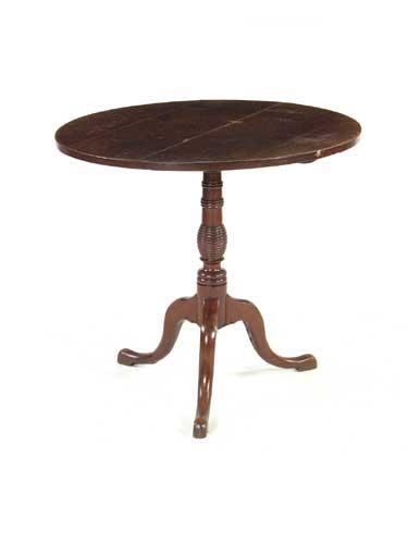 An early 19th century oak tripod table, the circular tilt top on a ring turned stem, 28in (71cm) h, 31in (79cm) dia. Old restoration.