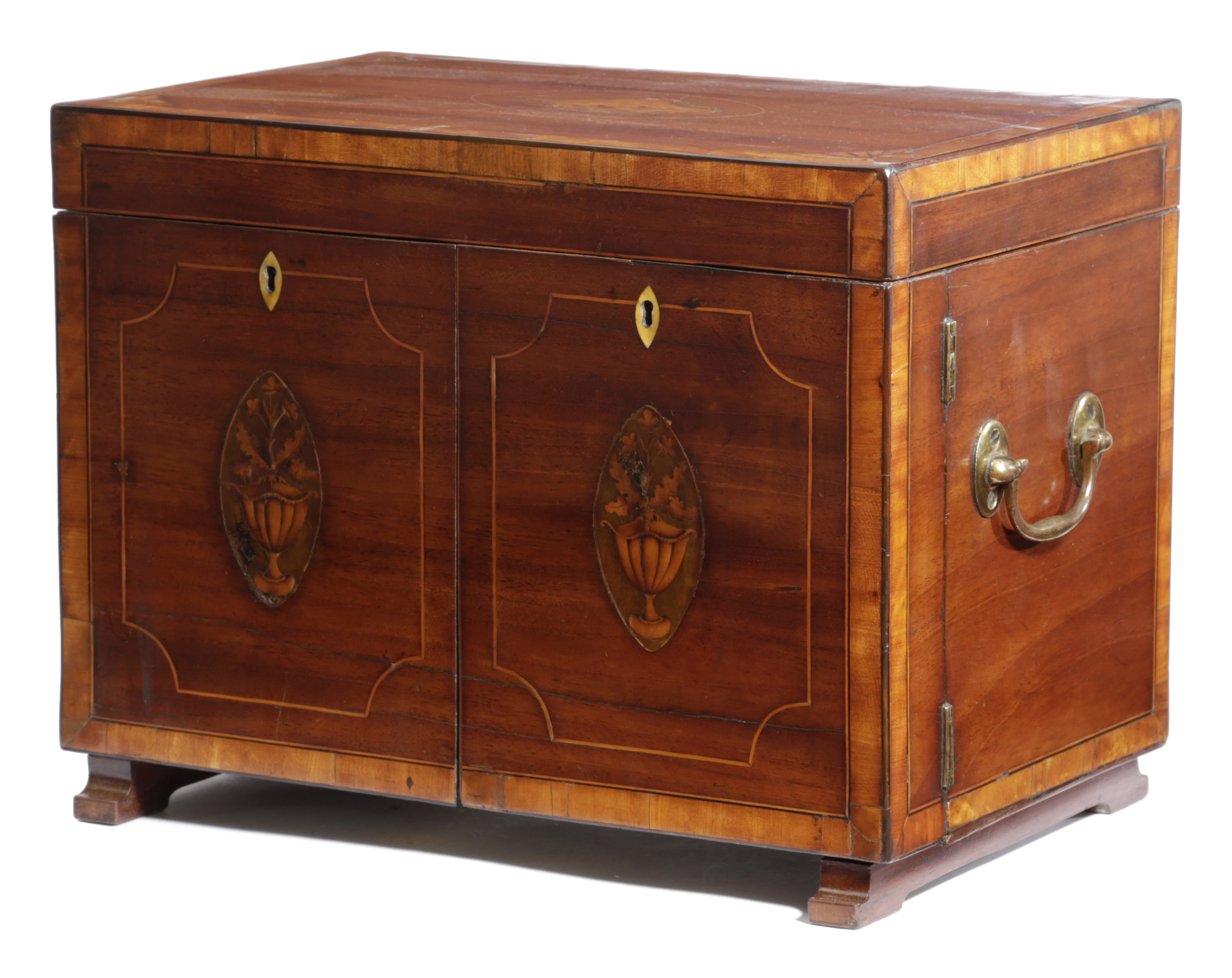 with satinwood banding and inlaid with a conch shell, urn and flower oval paterae, the hinged lid revealing divisions fitted with an assortment of later glass medicine bottles, the hinged front with push-button release revealing further bottles and a bank of ten satinwood veneered drawers, containing various medical instruments and utensils, on later feet