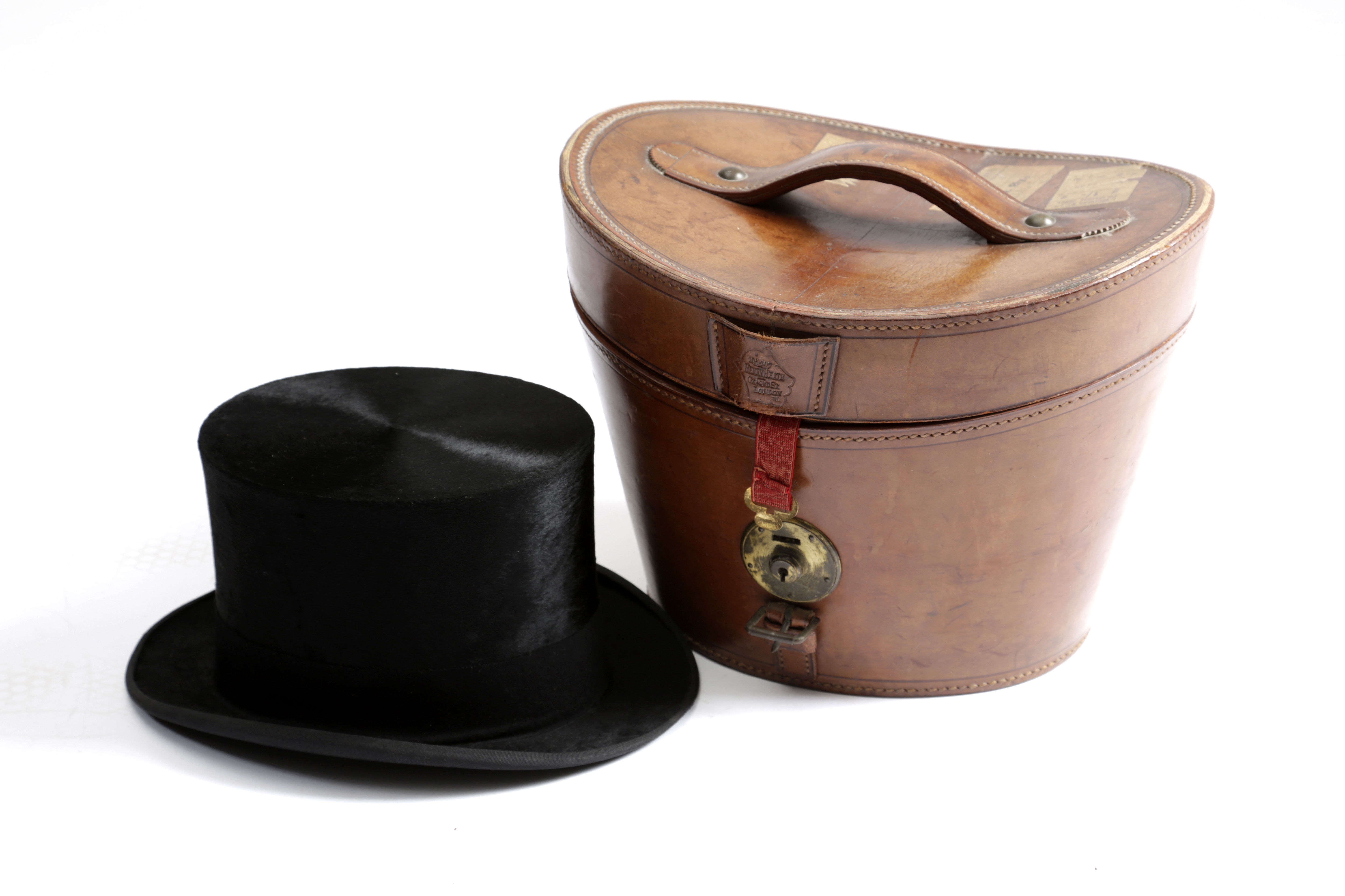 the interior marked with gilt initials 'Y H' and maker's marks, contained in a brown leather bucket shape hat box, stamped 'Henry Heath Oxford St. London W.' (2)