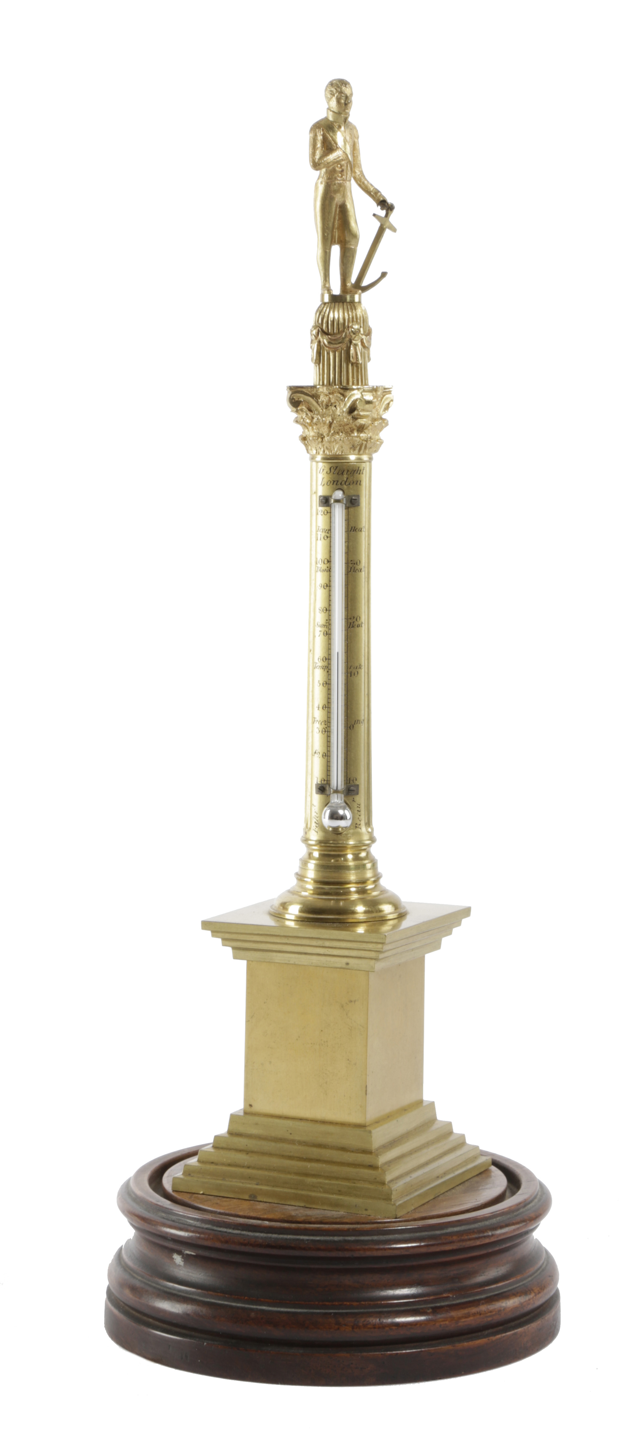 depicting Admiral Lord Nelson standing holding an anchor on a column, with a Corinthian capital, signed 'G. Staight, London', with a mercury thermometer, on a turned and moulded rosewood base, under a glass dome