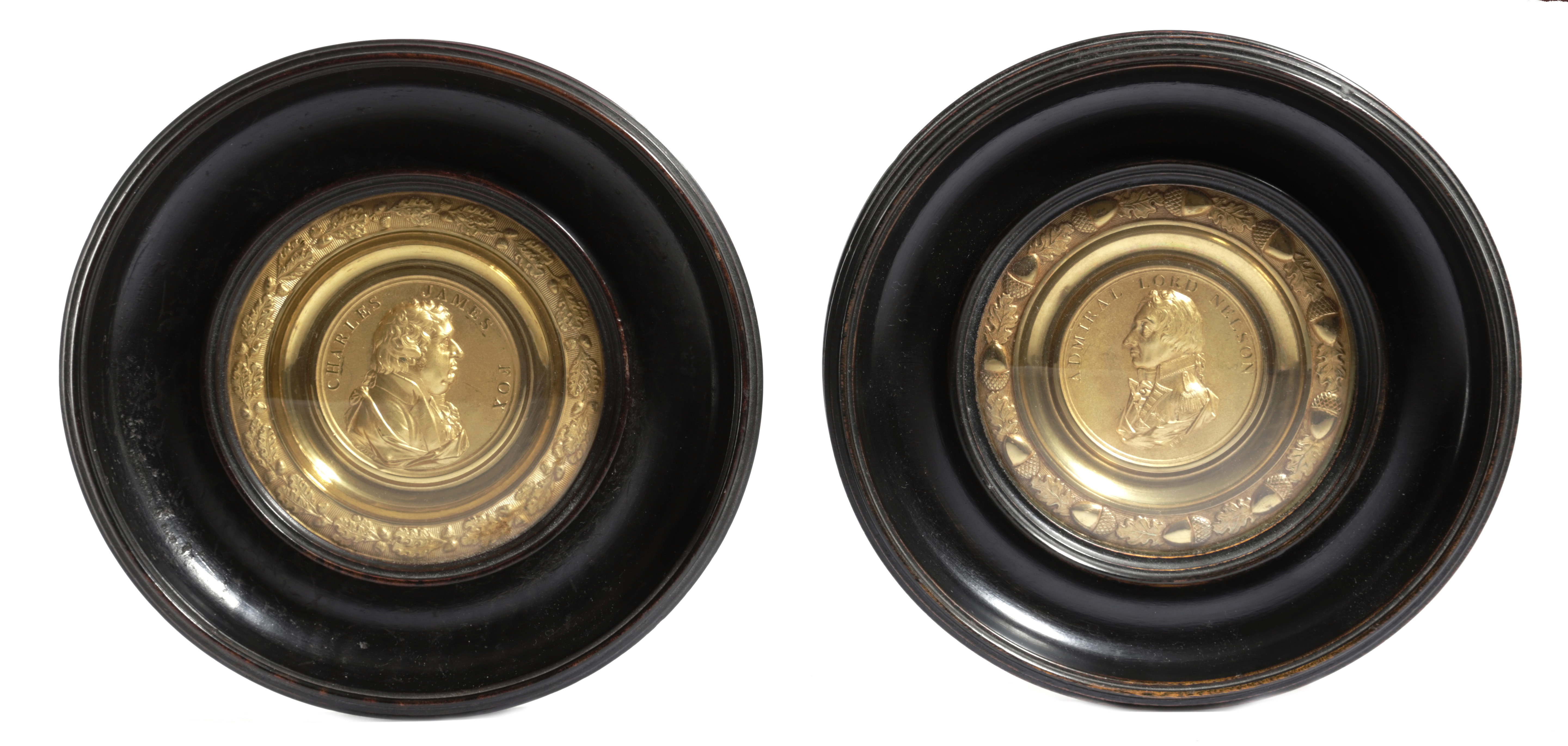 A PAIR OF GILT BRASS PORTRAIT MEDALLIONS OF LORD NELSON AND CHARLES FOX