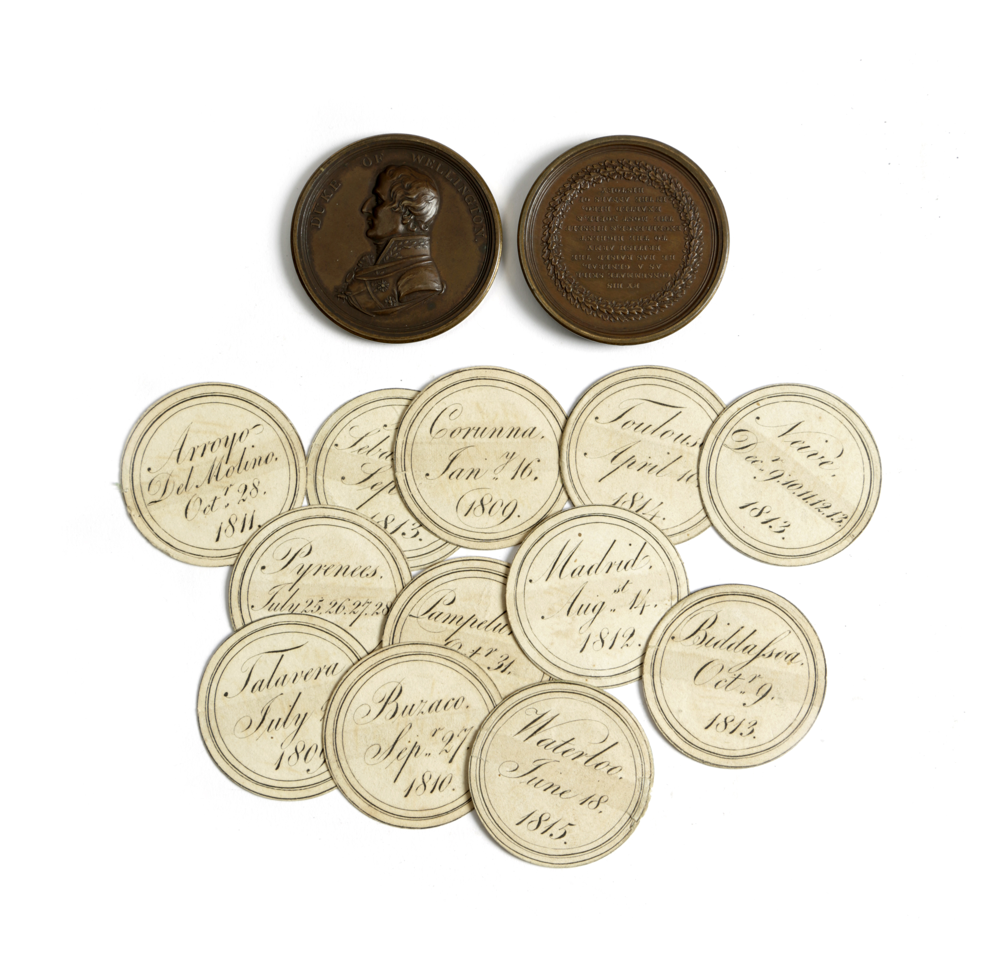 the cover with a portrait bust of the Duke of Wellington, containing twelve paper discs listing the British victories in Portugal, Spain and France, with dates, 1808-1815, with two fixed to interior of lid and base, the underside decorated with a wreath and text