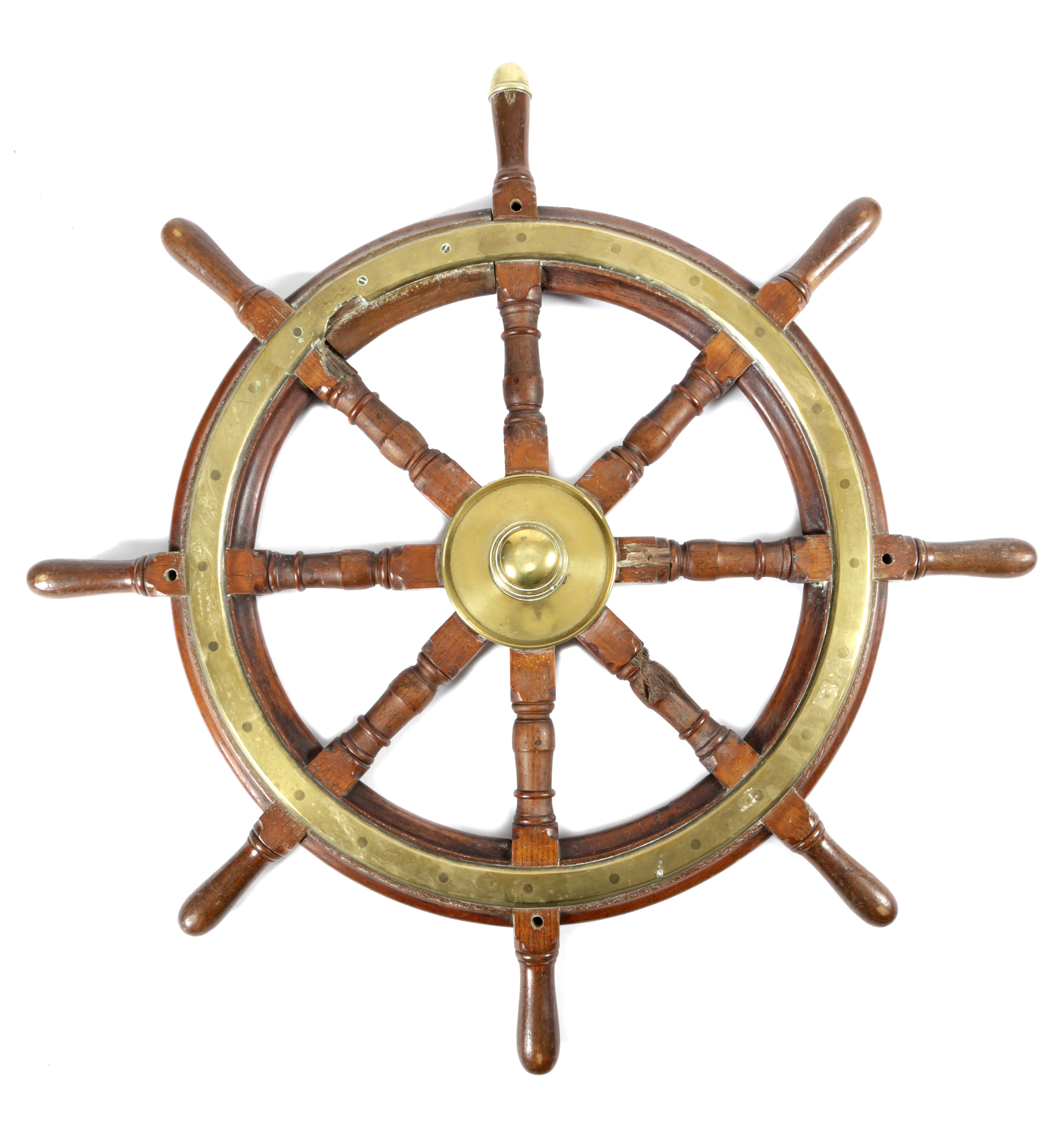 A TEAK BRASS MOUNTED SHIP'S WHEEL