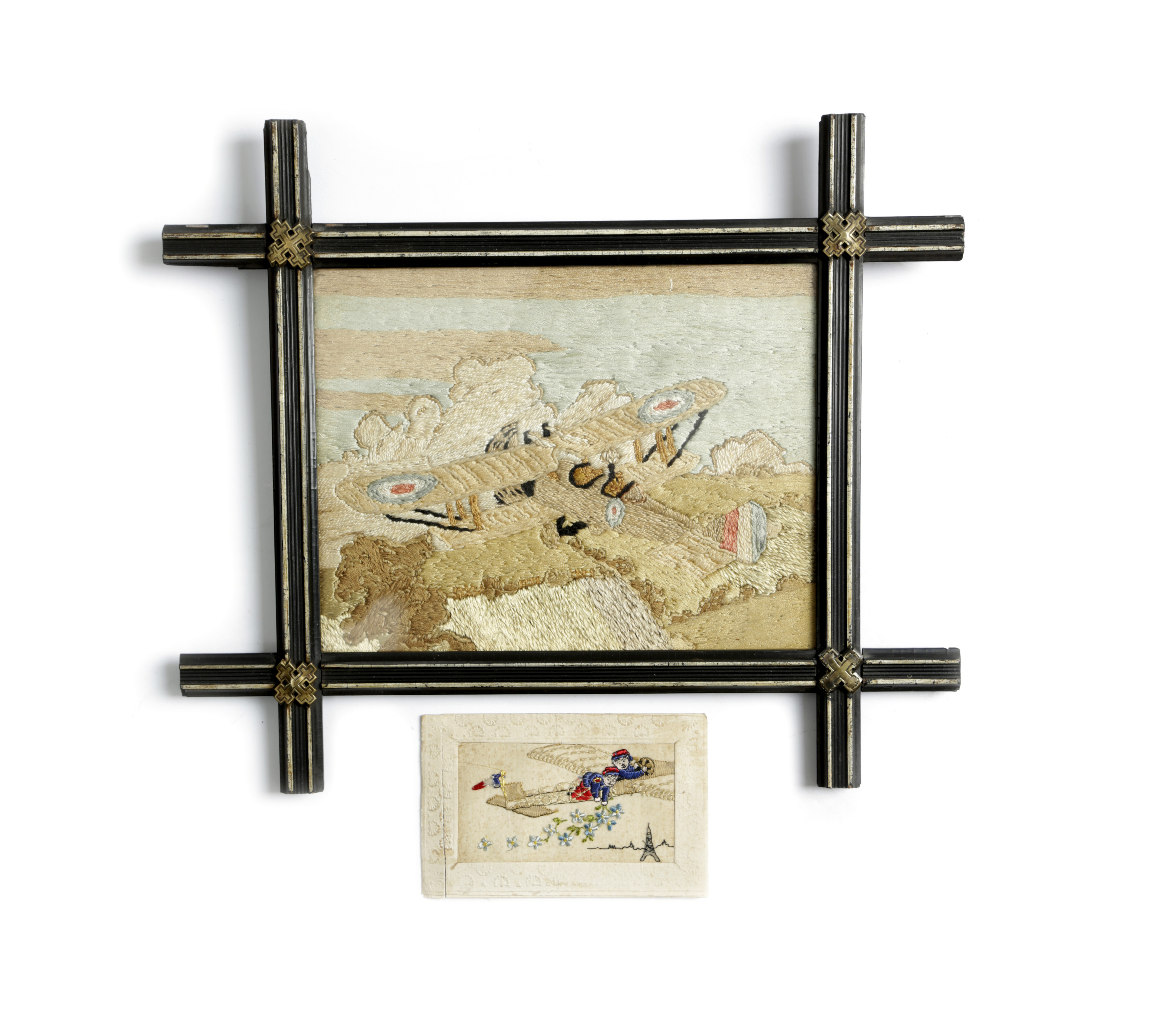 worked by driver, W. Waite, at Woodlands Hospital, Southport, 1922, depicting a World War I fighter plane, possibly a Sopwith Camel, in an ebonised glazed frame, together with a silkwork postcard of World War I interest, depicting a French fighter plane with two figures dropping flowers over Paris, dated 9th October 1917, the card printed by Paul Heckscher, Paris (2)
