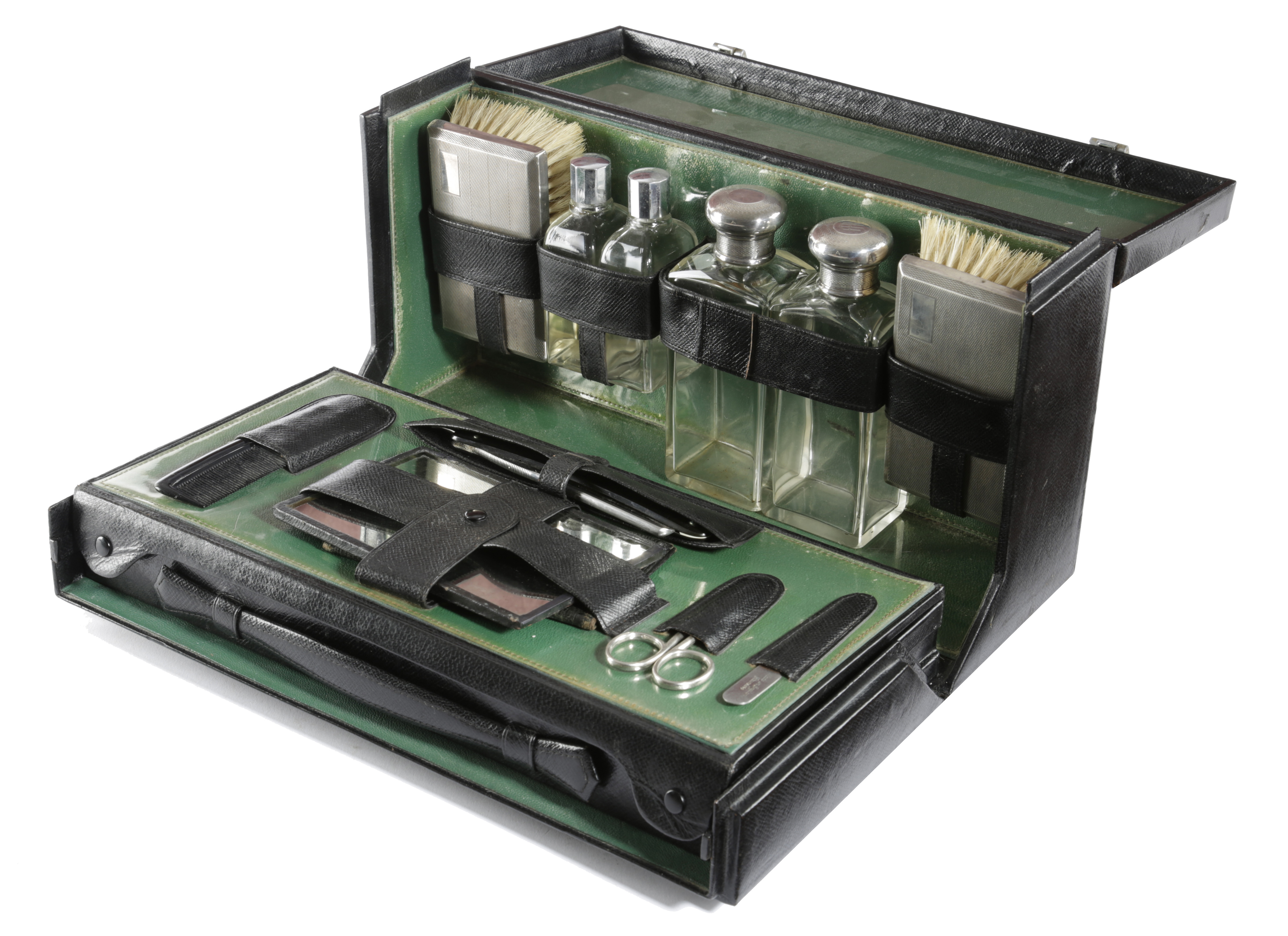 the hinged lid with initials 'R. M. C.', with a fall front revealing a green leather lined interior fitted with silver handled brushes and silver topped bottles, with a slide-out vanity section with a razor, comb, scissors, a mirror and with further bottles, a shaving brush and utensils, the silver hallmarked for London 1916