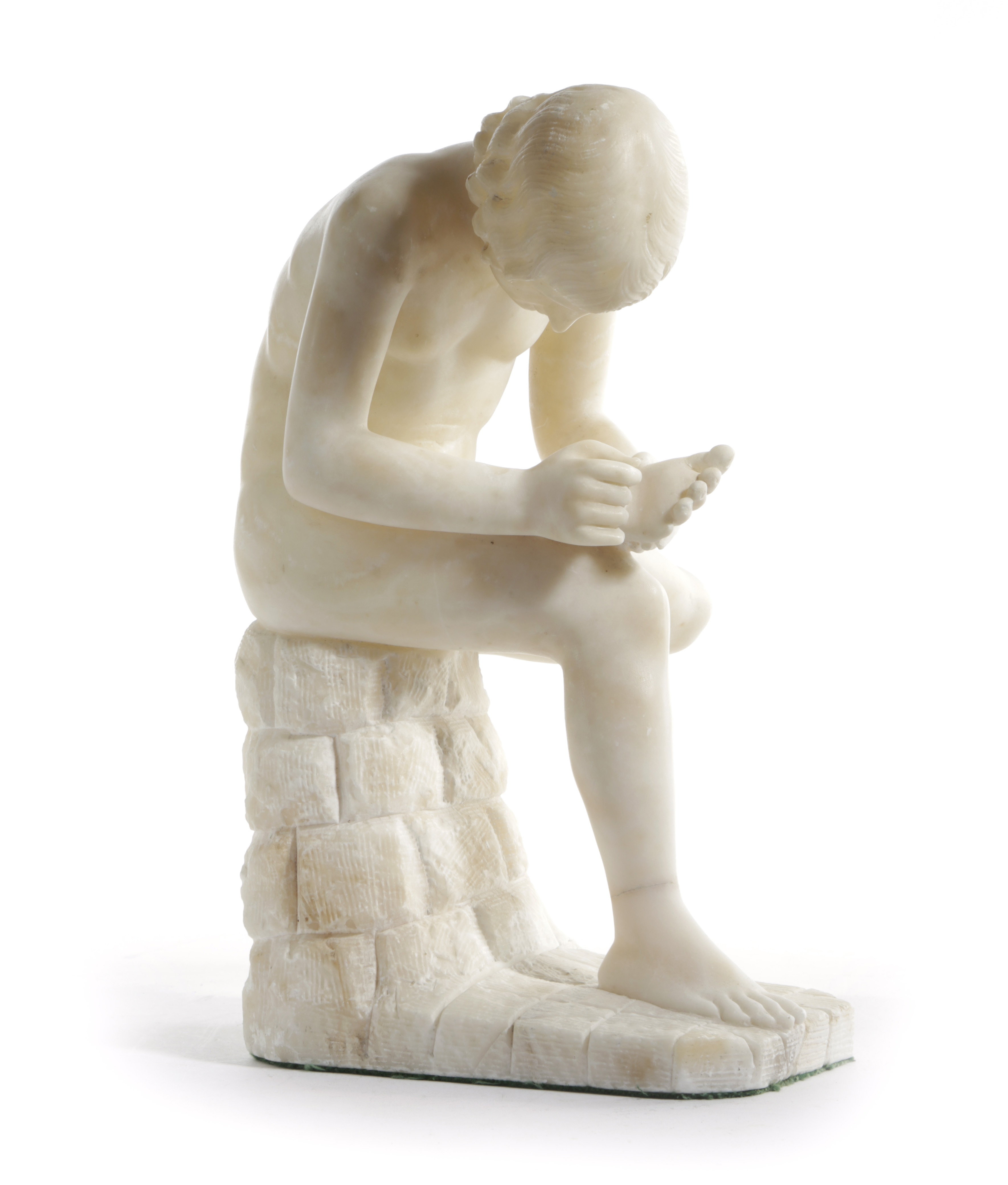 AFTER THE ANTIQUE. AN ITALIAN ALBASTER GRAND TOUR FIGURE OF SPINARIO