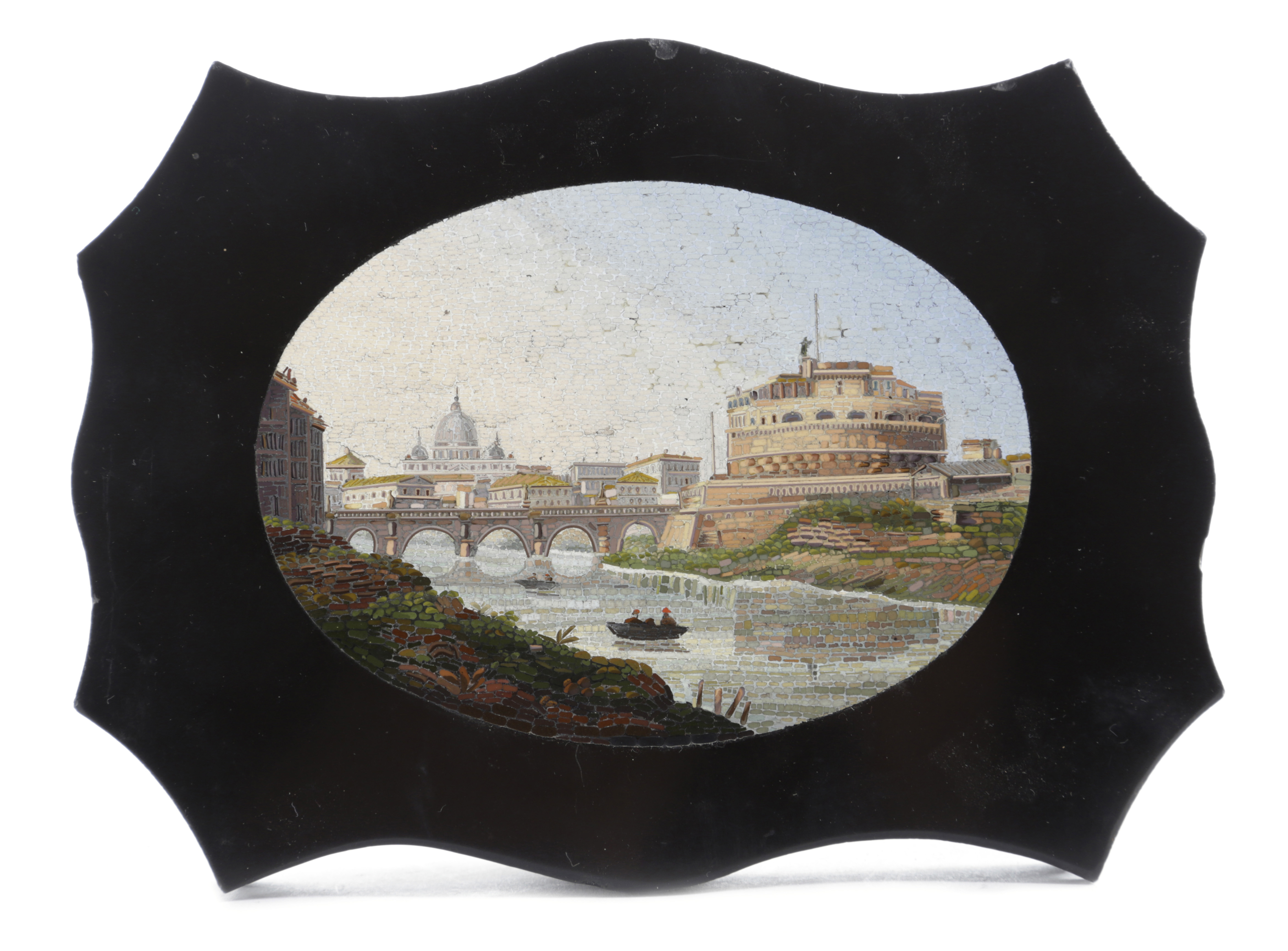 of black marble, with a serpentine moulded edge, inset with an oval topographical panel, depicting a view of St Peter's and the Castel Sant'Angelo, Rome