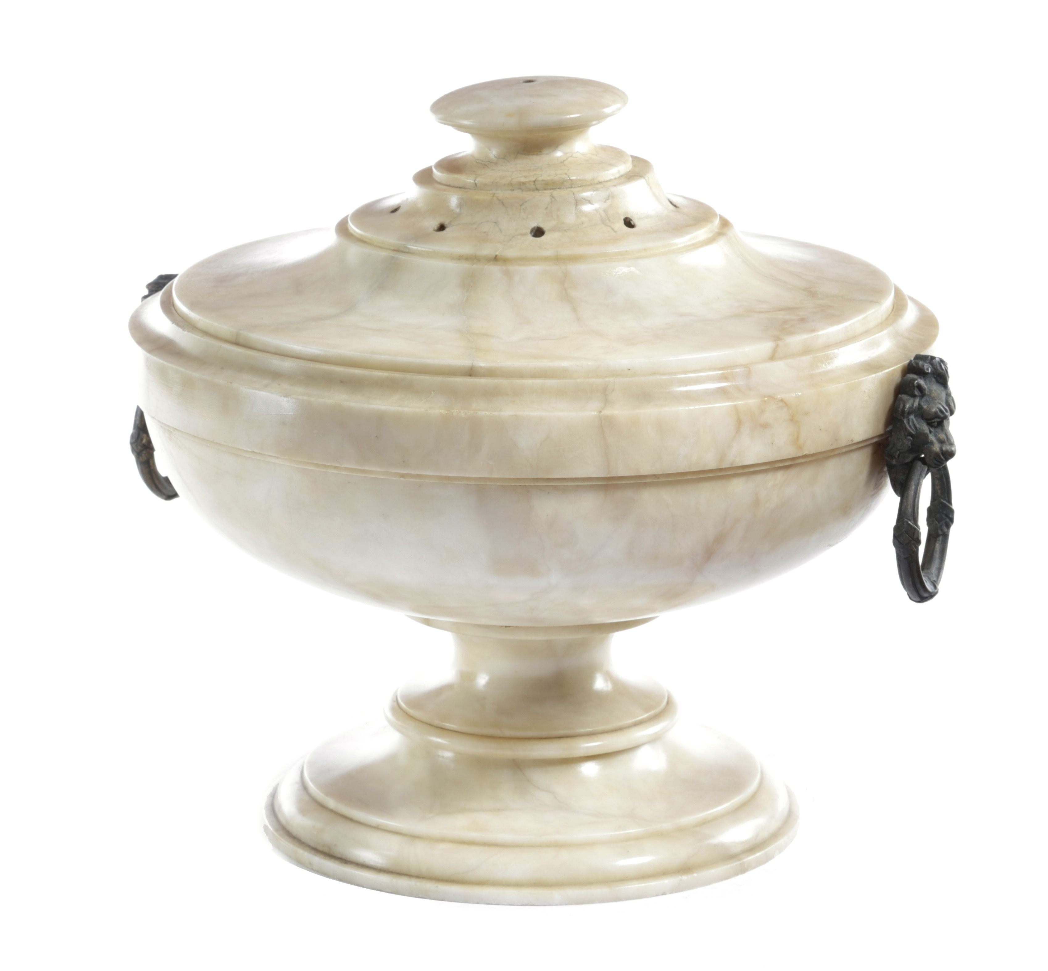 the pierced lift-off cover above a turned body, with bronze lion's mask ring handles