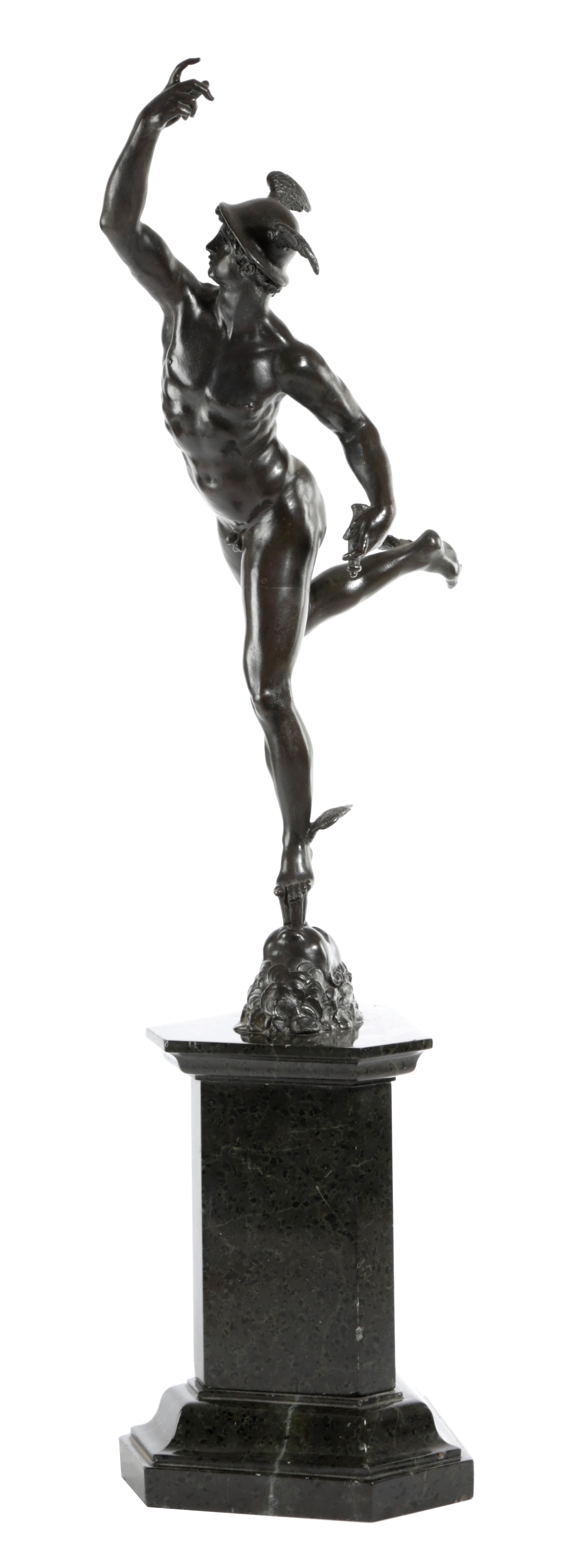 The finish of this bronze with precise pegged joints and neat patches suggest it was cast in the 18th century, a time when Giambologna's Mercury was not reproduced often.