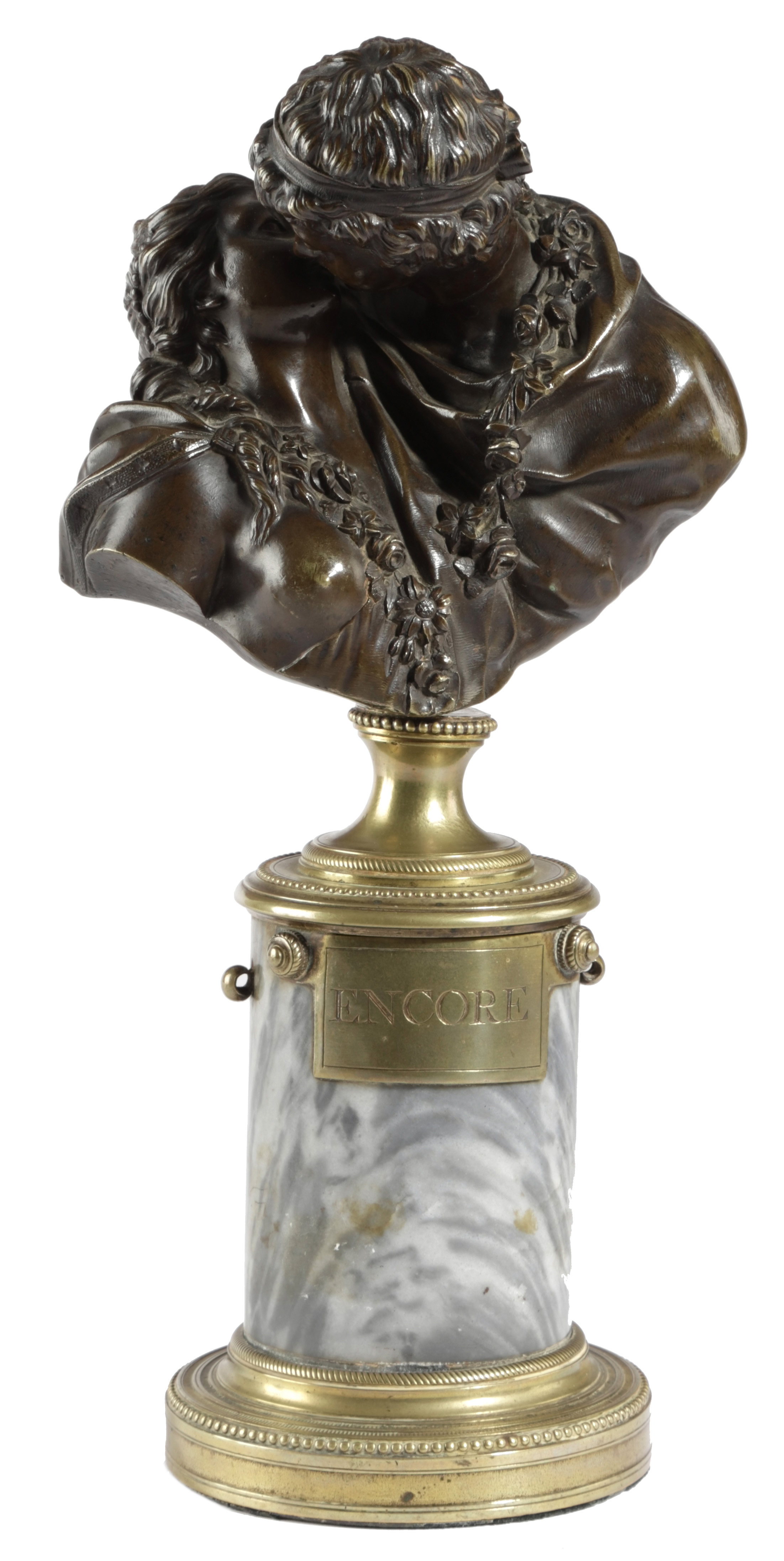 on a brass and bleu turquin pedestal, titled 'Encore'