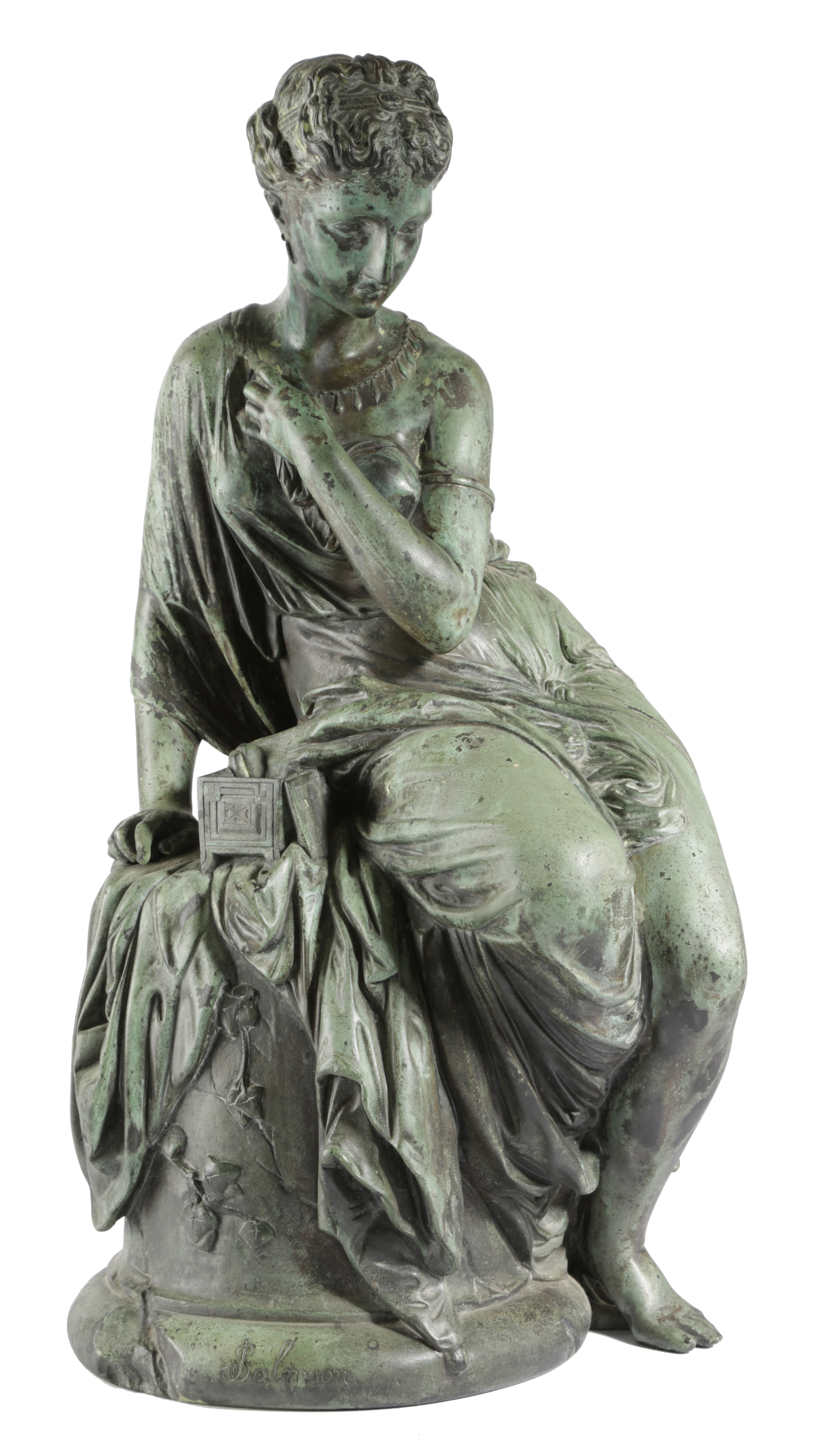 the classical maiden seated on an ivy clad plinth with her open box, with a verdigris finish