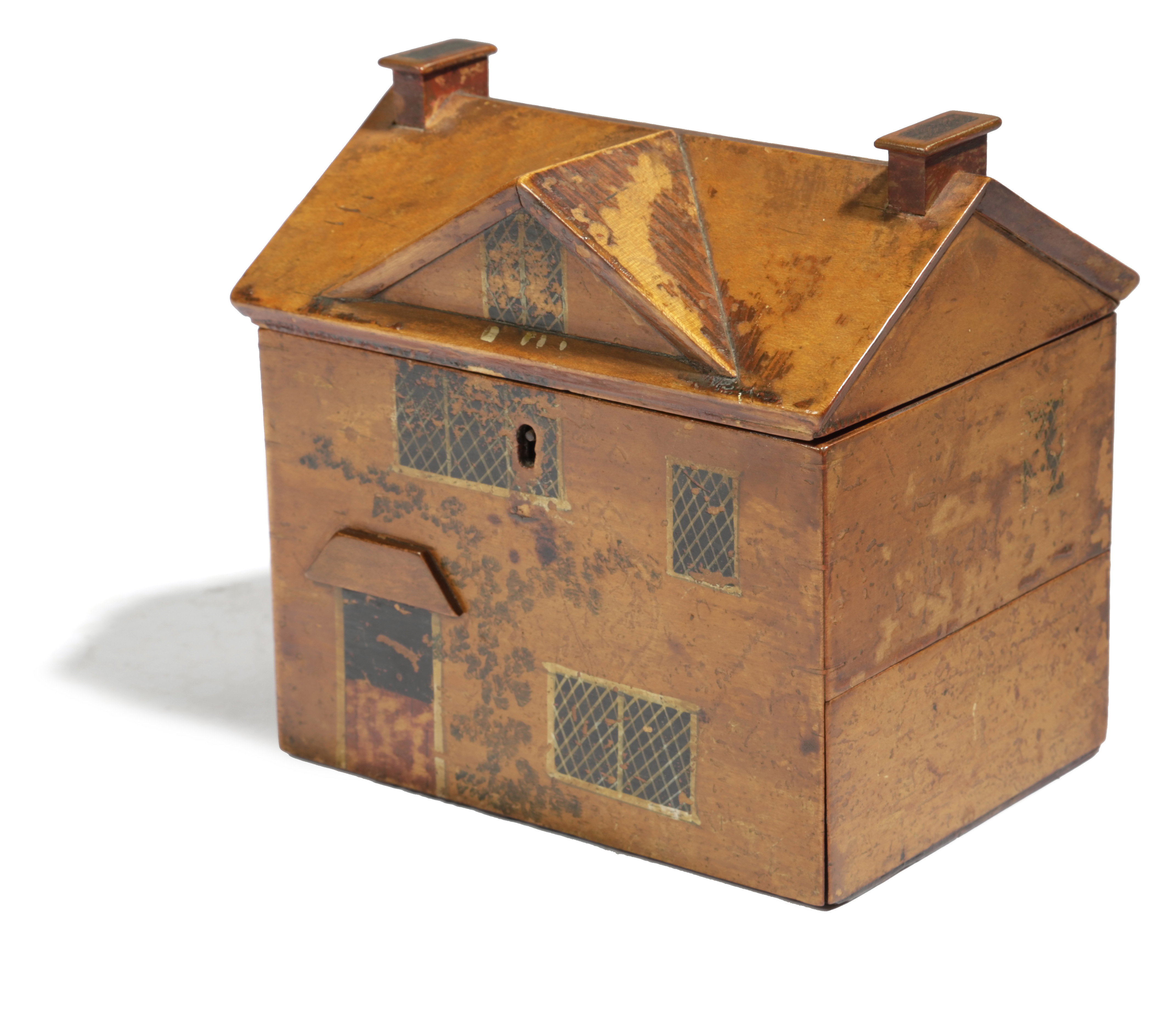 naively painted with windows and doors, the hinged roof revealing a lift-out tray, originally with divisions, with a bone tape measure and a thimble, above a pink paper lined compartment, the base with a conforming drawer with six divisions for spools