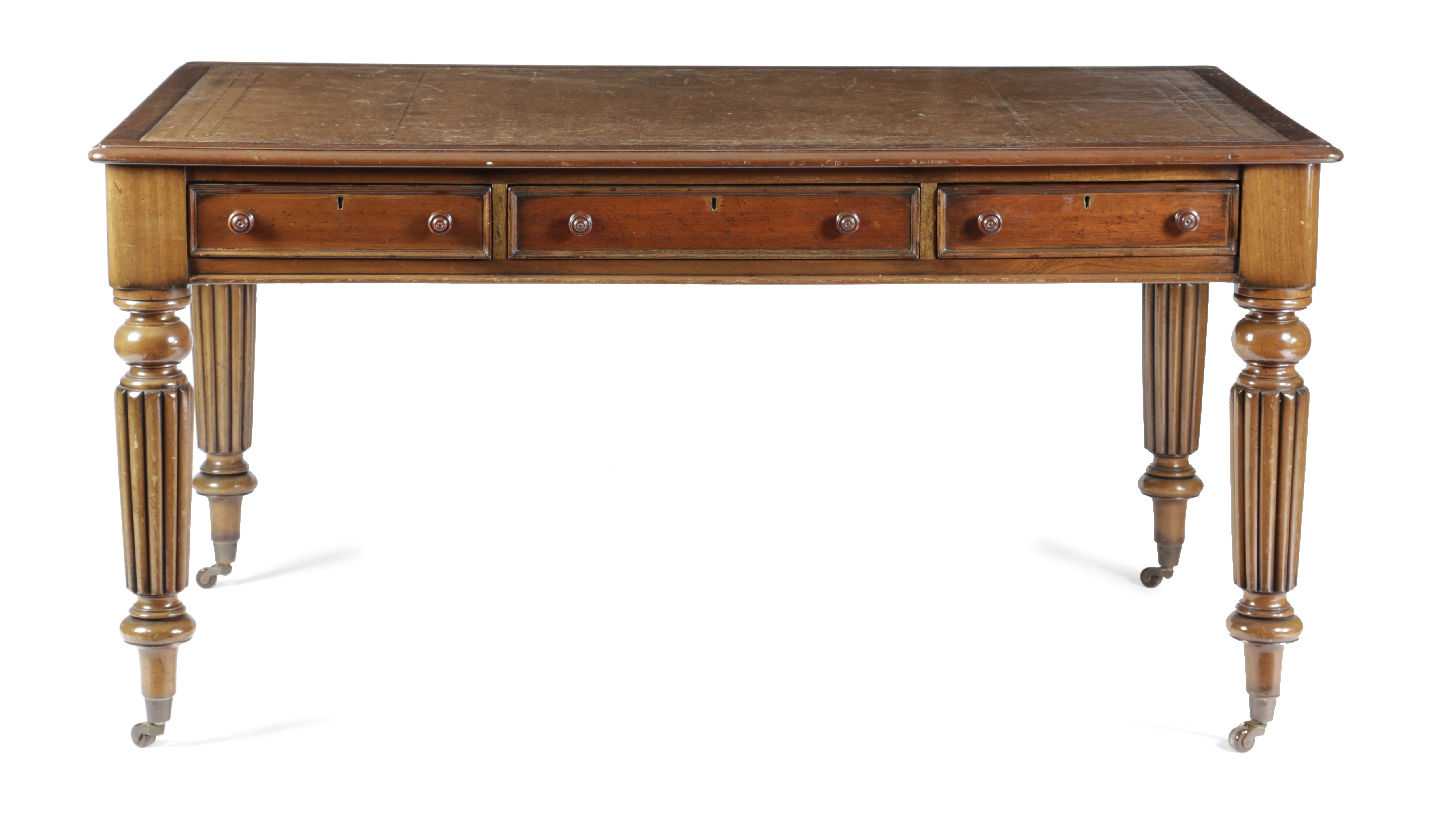 the moulded edge top inset with gilt tooled brown leather, above three frieze drawers, on ribbed tapering legs and ceramic castors