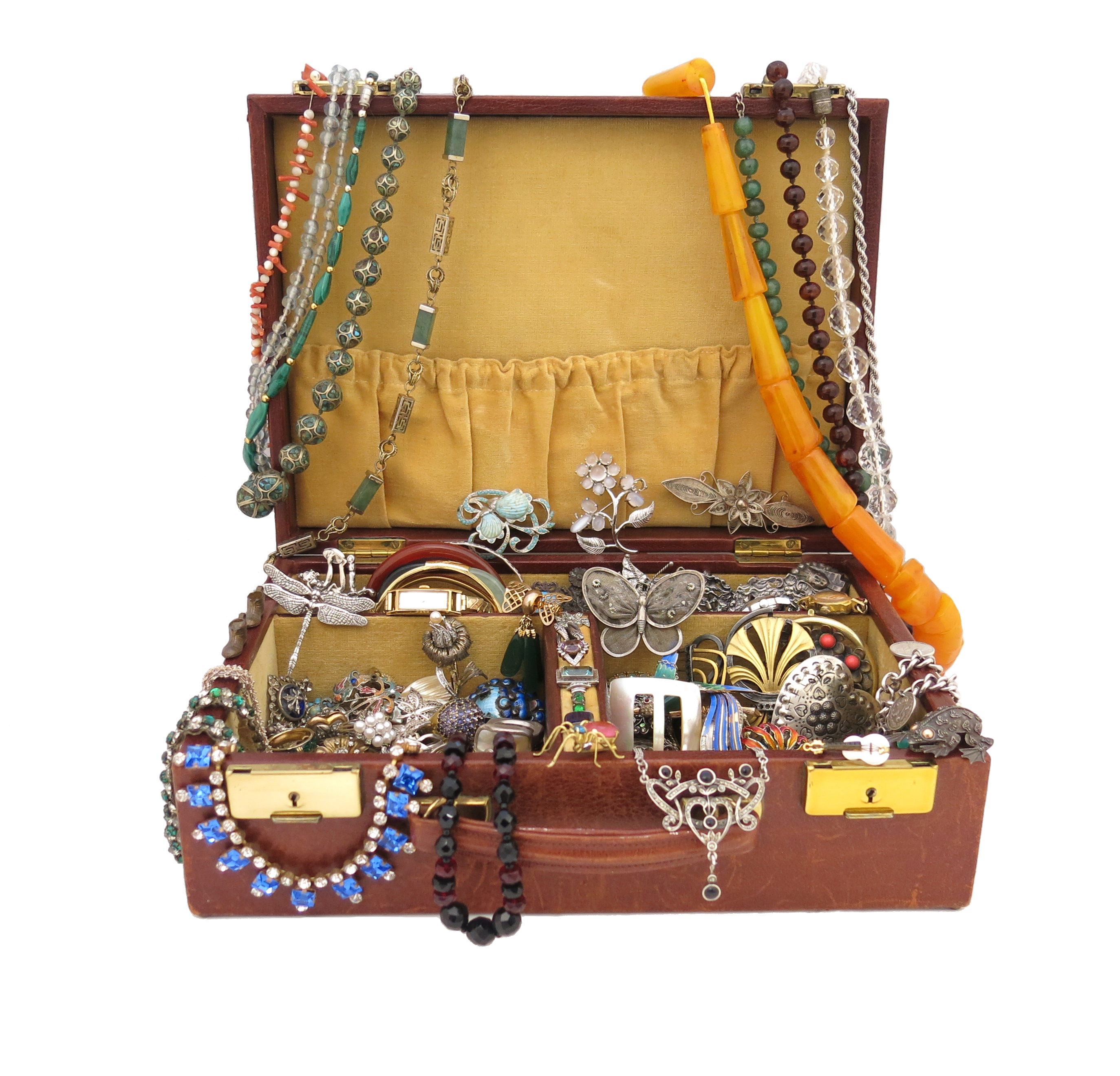 A large quantity of jewellery in a leather case including a pair of cut steel buckles, a set of enamel buckles, a silver mesh bag and many other items of jewellery and costume jewellery