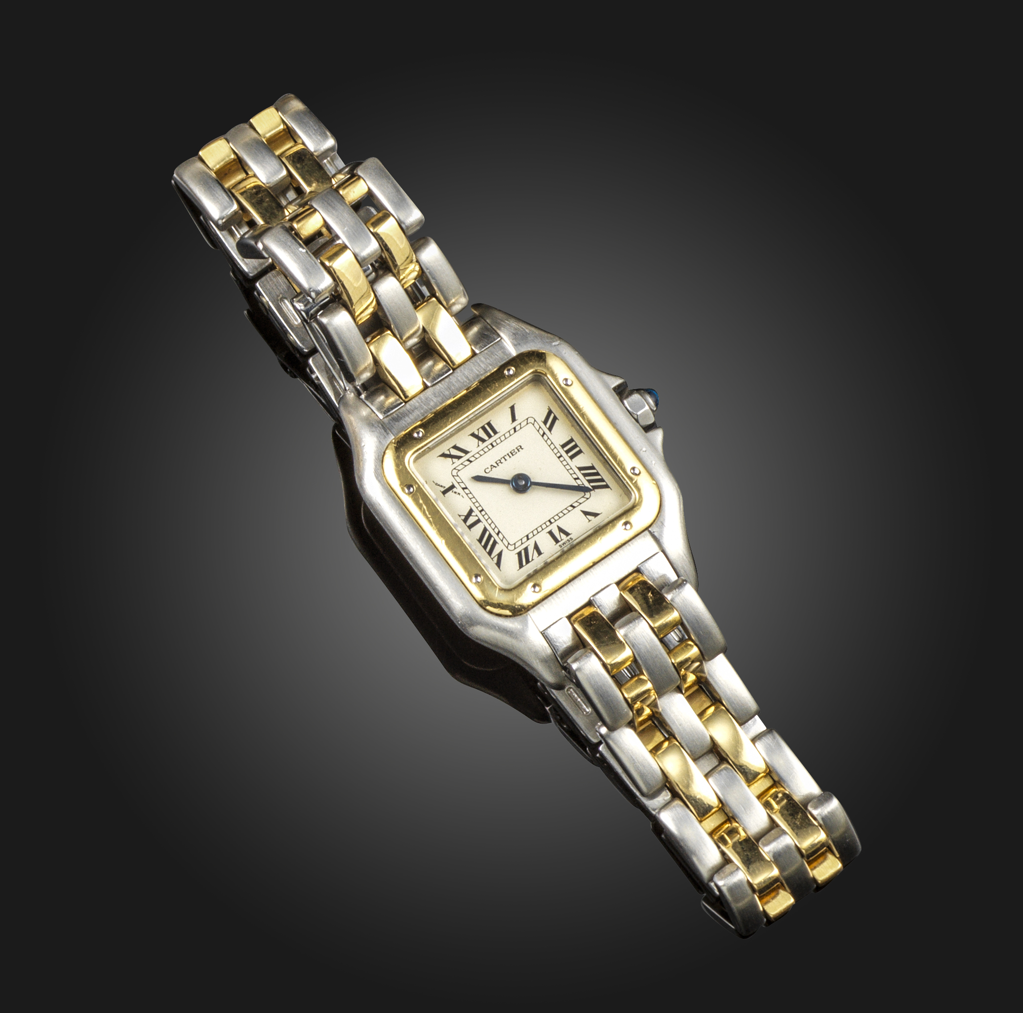 A lady's Panthere steel and gold wristwatch by Cartier, the signed dial with black Roman numerals, case 22mm, deployant clasp, quartz movement, box and papers